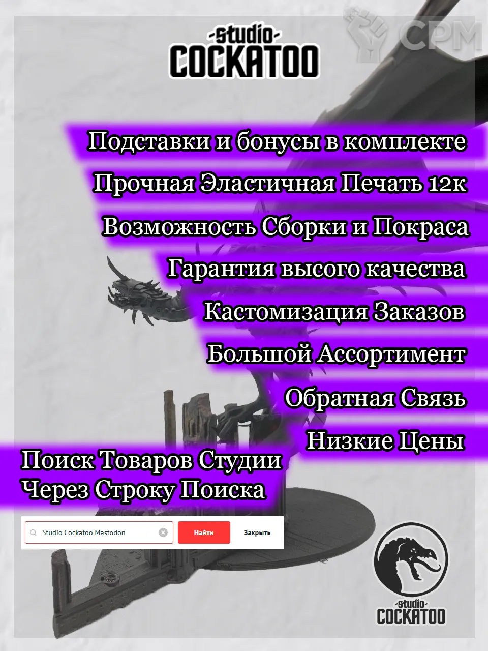 Для начала, хочу отметить, что заказ был не маленький и самое главное , что хочу отметить, качество печати. Тут все на очень хорошем уровне, цена и качество прекрасные, даже можно сказать что качество выше. Никакого брака и расслоений, поддержек почти нет, а главное нет сосков, которые после них остаются. Отдельно про упаковку, упаковали плотно и очень бережно, как для родственника. Насыпали черепков бонусом для оформления баз и нождачных брикетов для зачистки моделей, отдельный респект, подкупило знатно). Все отлично и без нареканий, на связь выходят мгновенно!! любой вопрос решают и идут на встречу. Одно единственное вонючее "но"... Невероятно долго, 2 месяца ждал заказ, думал и отправлять будут еще месяц, как это принято на СРМ, но отправили в день как поменяли статус, спасибо отдельное. Я искренне надеюсь, что так долго изза того, что пользуются спросом и завалены заказами. А в целом, отличная студия, всем рекомендую, не пожалеете точно, все сделано на уровне и организовано тоже. Кстати также положиди 3х дюймовую свою фирменную мондилку, тоже спасибо.