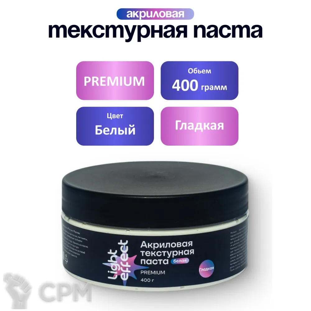 Текстурная паста гладкая от русского бренда "Light Effect" – это уникальный продукт, созданный специально для художников, которые стремятся добавить интересные фактуры и объем в свои произведения. Паста обладает легкой и шелковистой кремообразной консистенцией, что позволяет легко наносить её как с помощью кисти, так и с использованием шпателя или других инструментов.