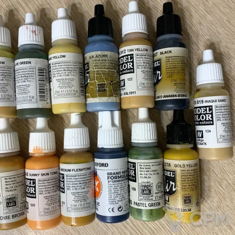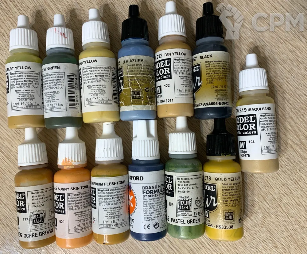 Половина пузырьков свежие-полные, остальные - видавшие виды. Все краски рабочие под кисть, аэром не дул.