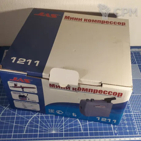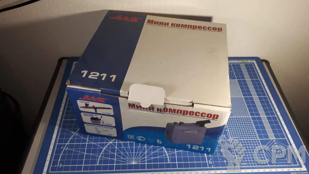 Маленький компрессор. Приобретался как запасной вариант на всякий случай, в целом так и не пригодился. На большие и длительные работы (грунтовка, нанесение базовых цветов на армию за раз) не подходит, для единичной не супер точной работы, вполне сгодится.