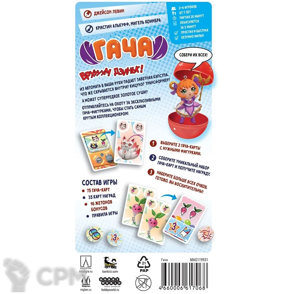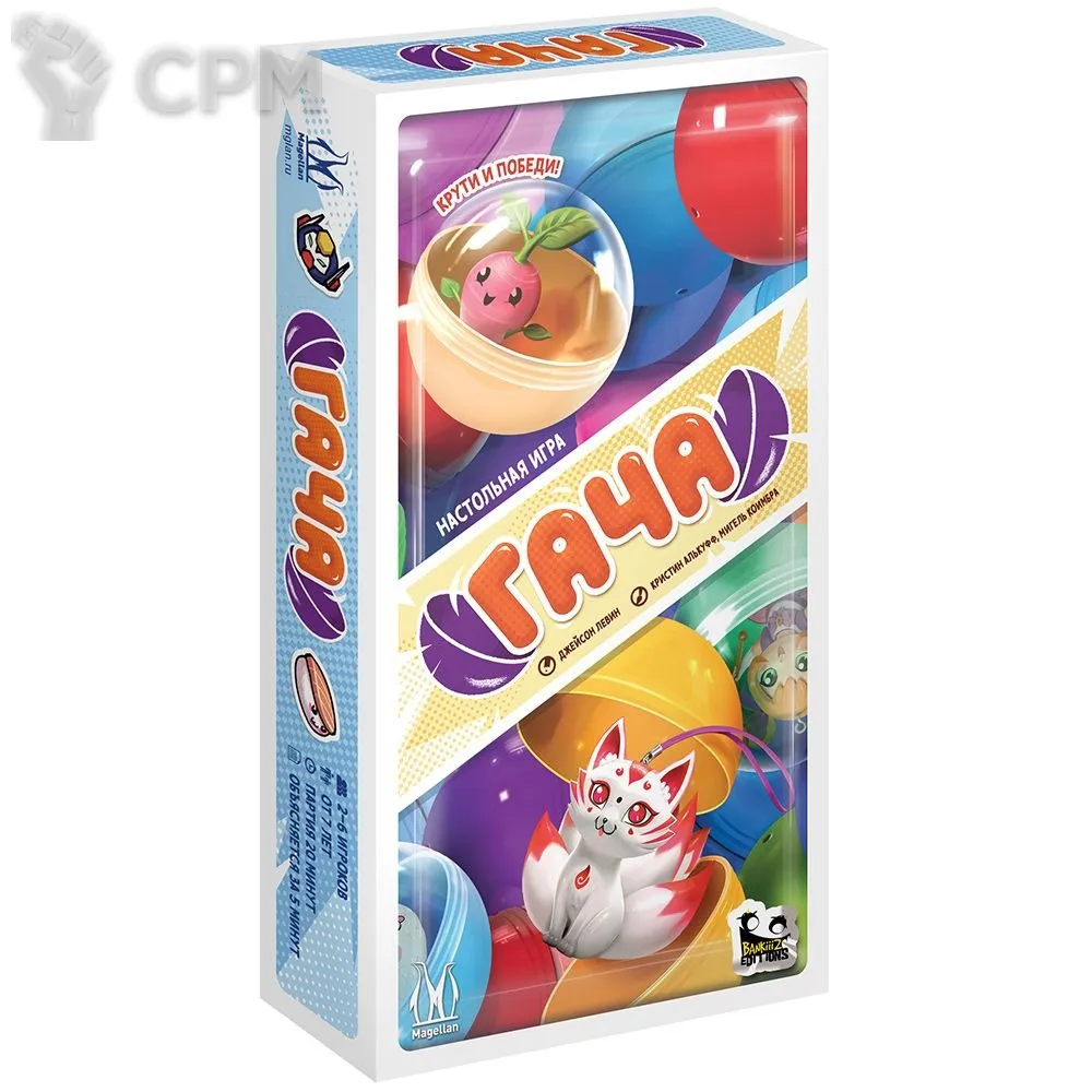 В настольной карточной игре "Гача" вы станете коллекционерами одноимённых игрушек! Какая фигурка вам достанется из аппарата: будет ли это трансформер или кицунэ? А может быть вам попадётся очень редкое позолоченное суши? Как бы то ни было, постарайтесь собрать наиболее ценную коллекцию фигурок и получите за неё наибольшее количество очков!