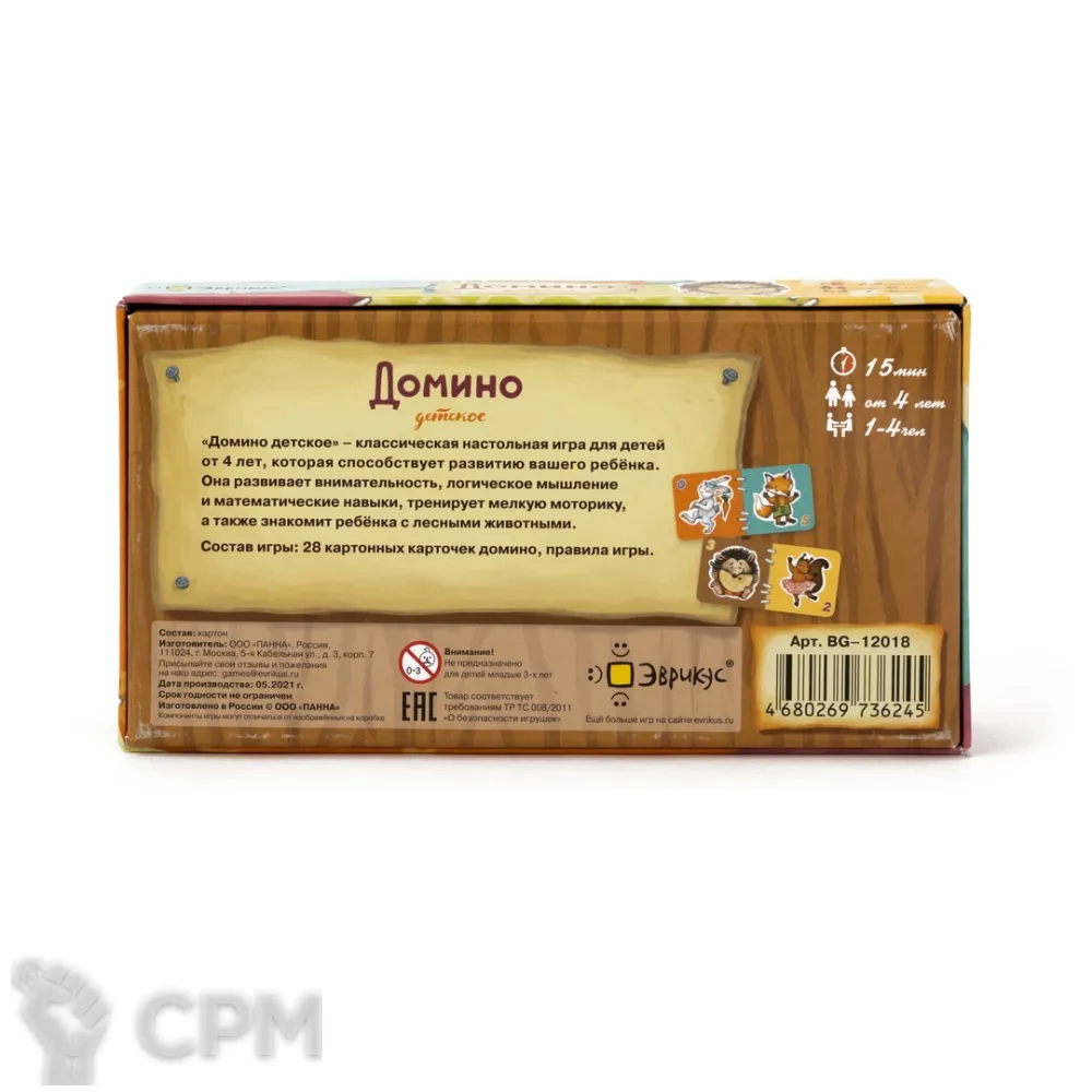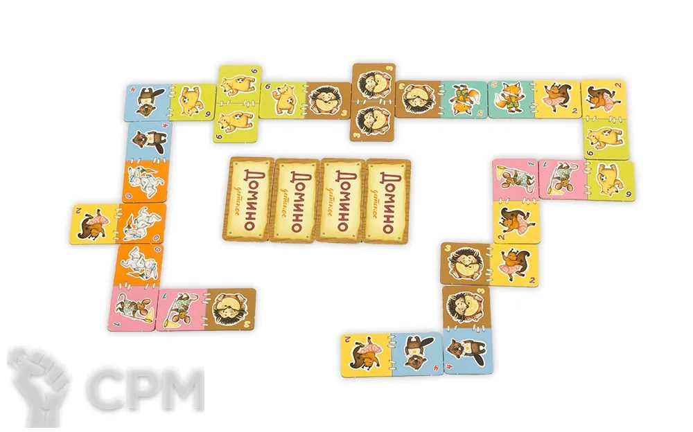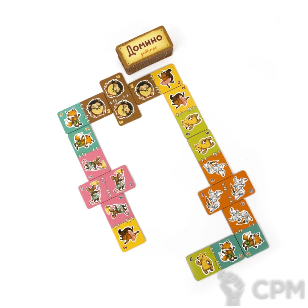 "Домино детское" от издательства Эврикус — красочная развивающая игра с толстыми картонными фишками. Вместо точек на карточках изображены зверята.