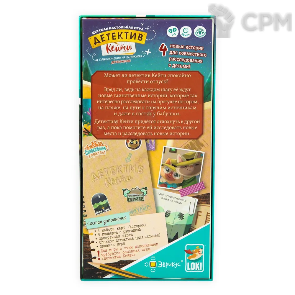 "Детектив Кейти: Приключения на каникулах" — это дополнение к детективной настольной игре "Детектив Кейти" с 4 новыми расследованиями. Новые происшествия в дополнении сложнее, содержат элементы квестов, шифрования и логические загадки.