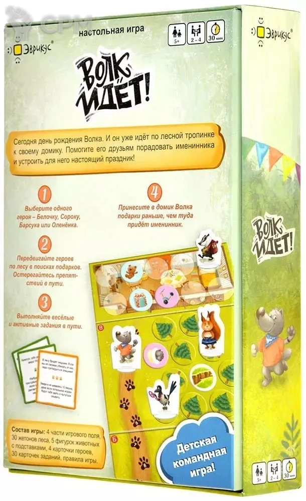 "Волк идёт" – это семейная настольная игра, в которой всем игрокам нужно будет объединиться и устроить своему другу Волку отличную вечеринку на день рождения. Рецепт такой вечеринки известен каждому – тортики, свечки, шарики, подарки... Но Волк уже идёт домой, а сюрприз не готов! Белочке, Барсучку, Оленёнку и Сороке следует поторопиться, ведь если Волк придёт в пустой дом, то расстроится, что друзья о нём забыли. Вот они и бегают по лесу, разыскивая гостинцы и подарки – главное опередить именинника и первыми оказаться у него дома со всем необходимым.