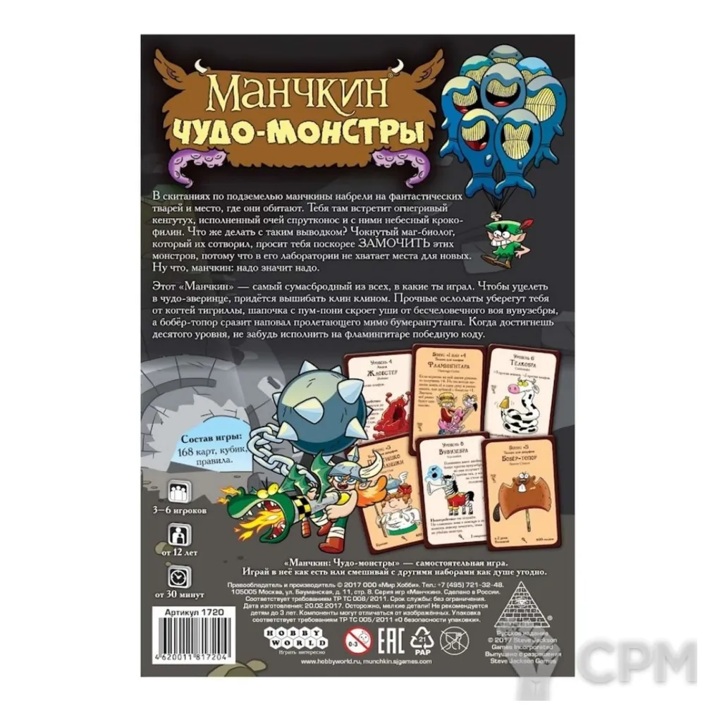 Этот "Манчкин" – самый сумасбродный из всех, в какие ты играл. Чтобы уцелеть в чудо-зверинце, придётся вышибать клин клином. Прочные ослолаты уберегут тебя от когтей тигриллы, шапочка с пум-пони скроет уши от бесчеловечного воя вувузебры, а бобёр-топор сразит наповал пролетающего мимо бумерангутанга. Когда достигнешь десятого уровня, не забудь исполнить на фламингитаре победную коду.