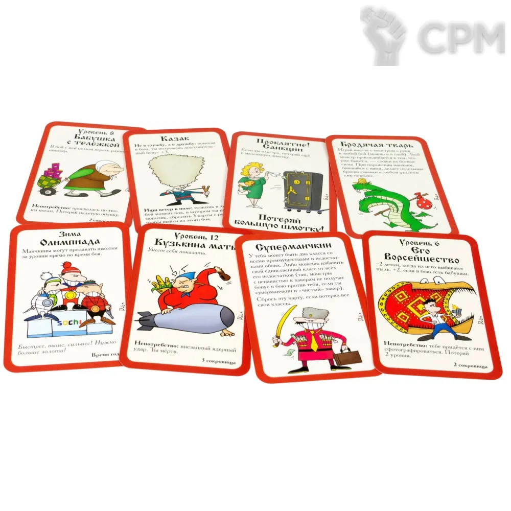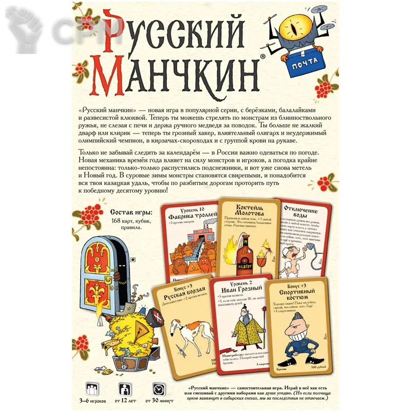 Готовь меч-леденец и коктейль Молотова, зови Топтыгина, пусть расскажет тебе о лихих девяностых, а ты ему поведаешь все прелести отключения воды. Затягивай потуже портянки, поправь укокошник, поднастрой верную балалаечку и вперёд, к десятому уровню! "Русский манчкин" – это самостоятельная игра на основе классической версии.