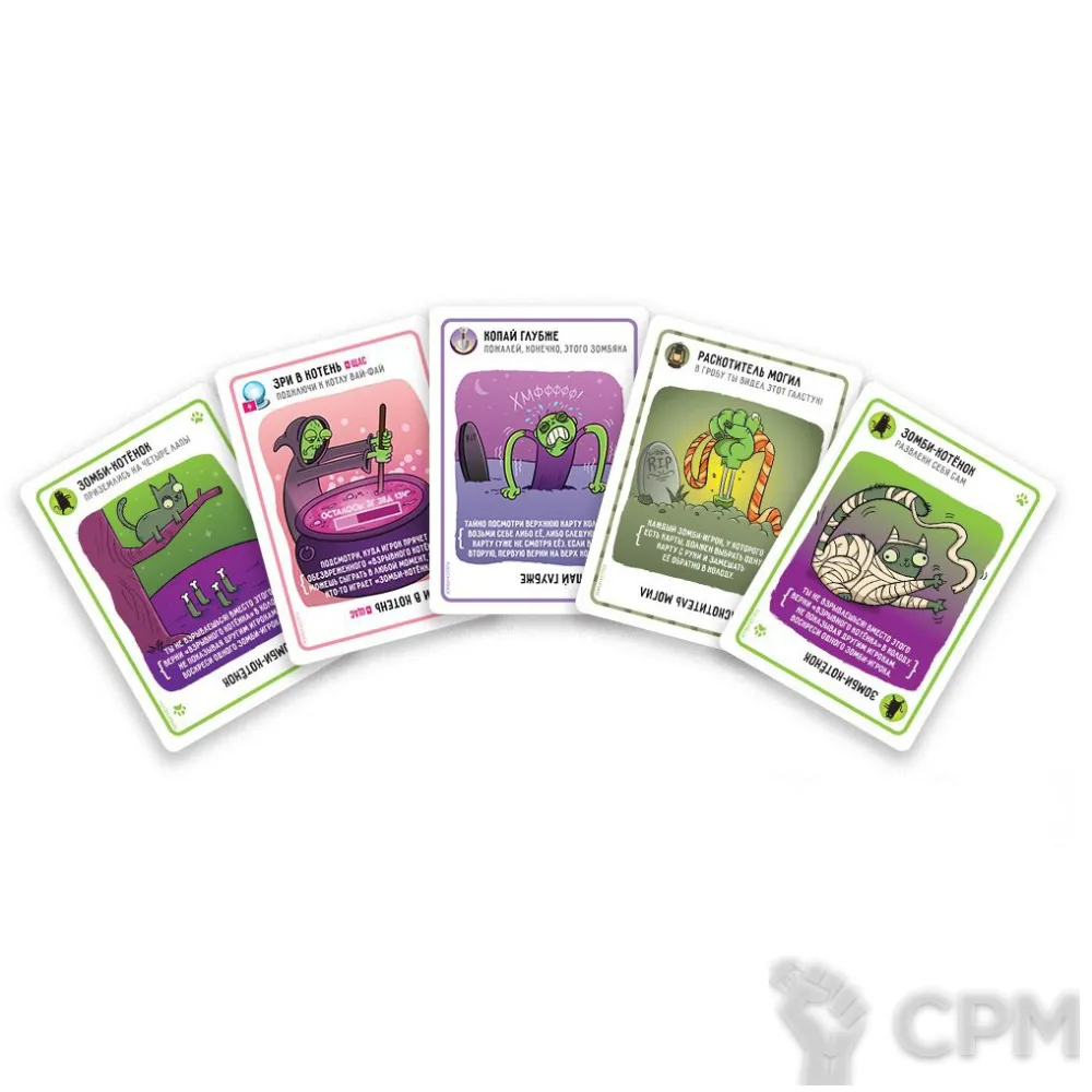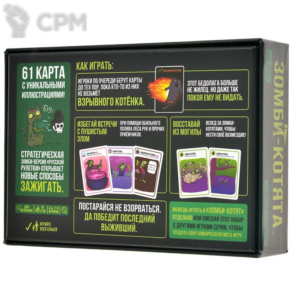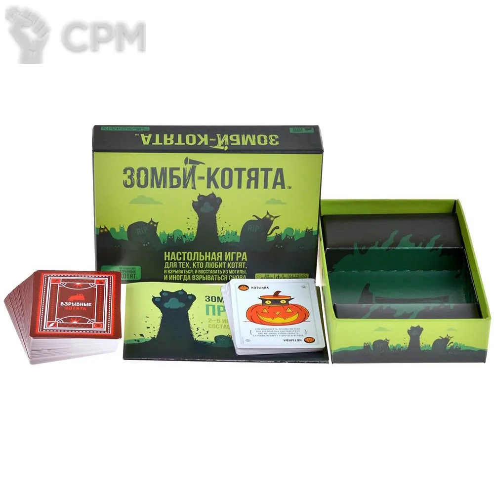 "Зомби-котята" – это новый взгляд на полюбившуюся многими карточную игру "Взрывные котята". Вам стало мало возможностей классической версии? Уже приелись горячие и откровенные шутки версии "18+"? Тогда "Зомби-котята" – это то, что вам нужно! Всё та же стратегическая "русская рулетка" с простыми правилами и бодрым игровым процессом, но наполненная новыми способами зажечь за столом! Тащите карту из колоды и молитесь, чтобы взрывной котёнок не попался вам в руки, однако теперь простым вылетом из игры вы не отделаетесь...
