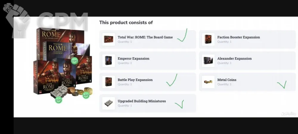 Total War: Rome. База + Battle Play Expansion (в пленке) + Металлические монеты и платиковые здания с Gamefound. Игралась 1 раз. Состояние отличное. Продаю все, что было издано на данный момент в рамках этого проекта. Прочие дополнения должны быть выпущены в течение года - можем сохранить контакт, если они будут вас интересовать.