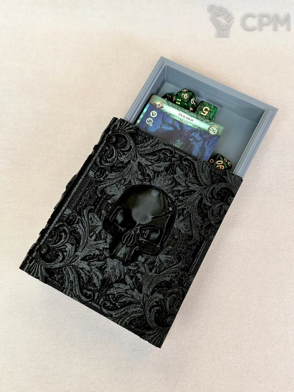 Можно использовать и как бокс для хранения карт или кубиков, и как трей для бросания кубиков во время игры.
