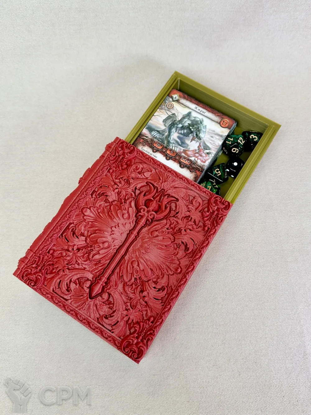 Можно использовать и как бокс для хранения карт или кубиков, и как трей для бросания кубиков во время игры.