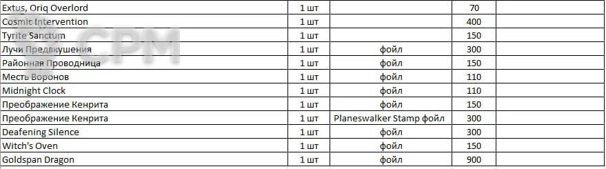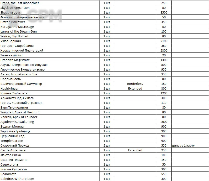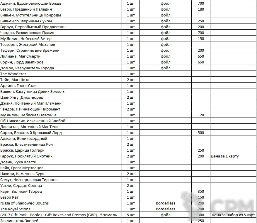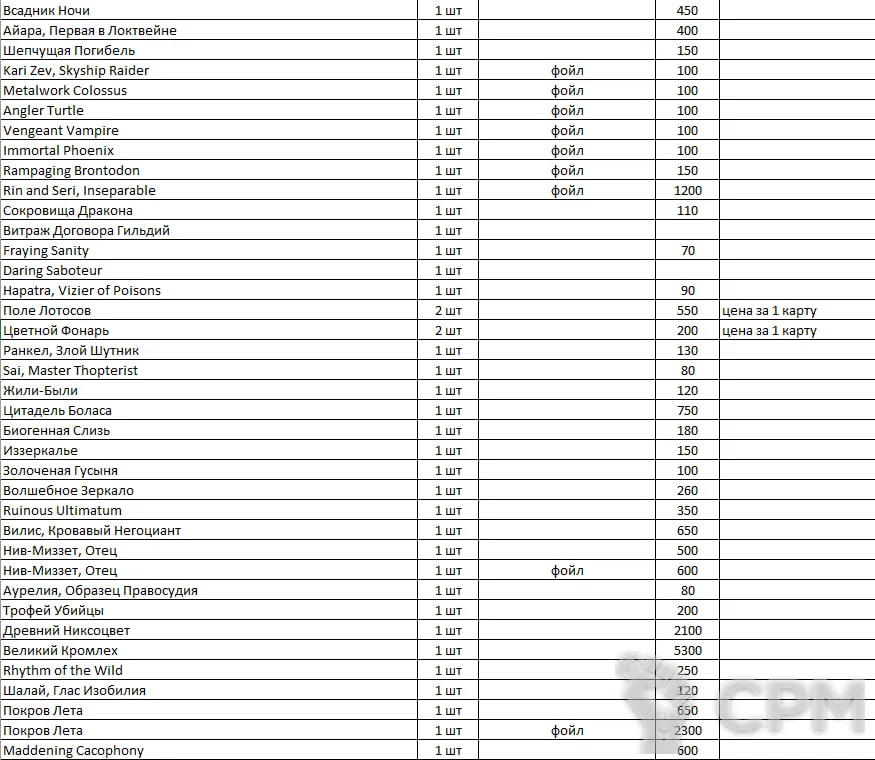Распродаю синглы MTG. Во вложении фото таблицы с разбивкой по Названию/Количеству/особенностям карт/цене. Картами не играл вообще.