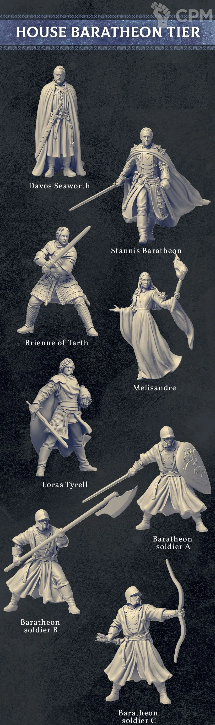 Набор «Дом Баратеонов» представляет собой коллекцию из 9 миниатюр Дома Баратеонов. В этот набор входят:
