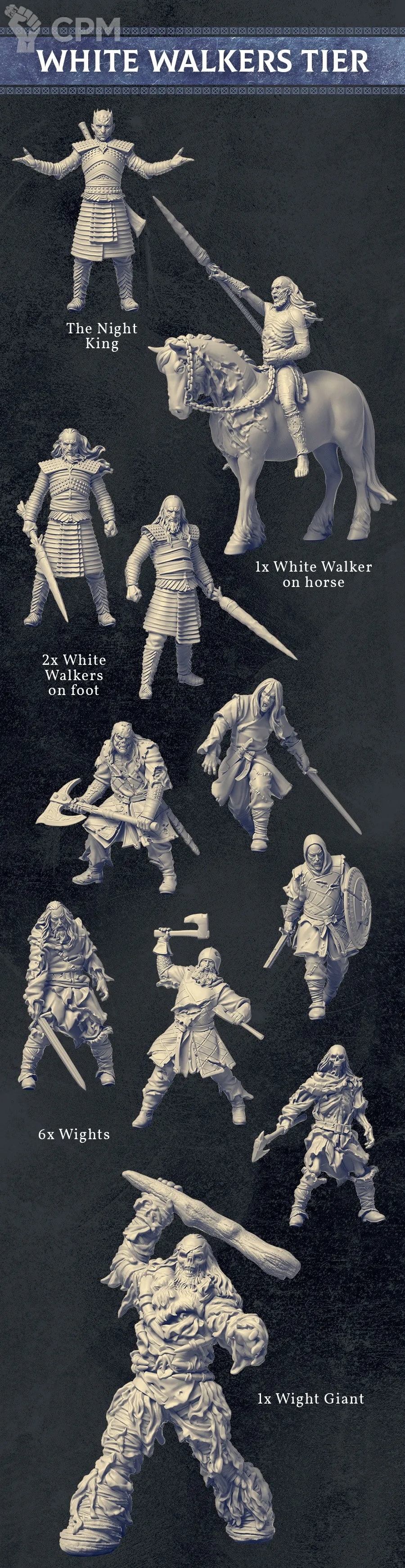 Набор «Белые ходоки» представляет собой коллекцию из 11 миниатюр, демонстрирующих леденящую душу угрозу, исходящую от нежити. В этот набор входят: