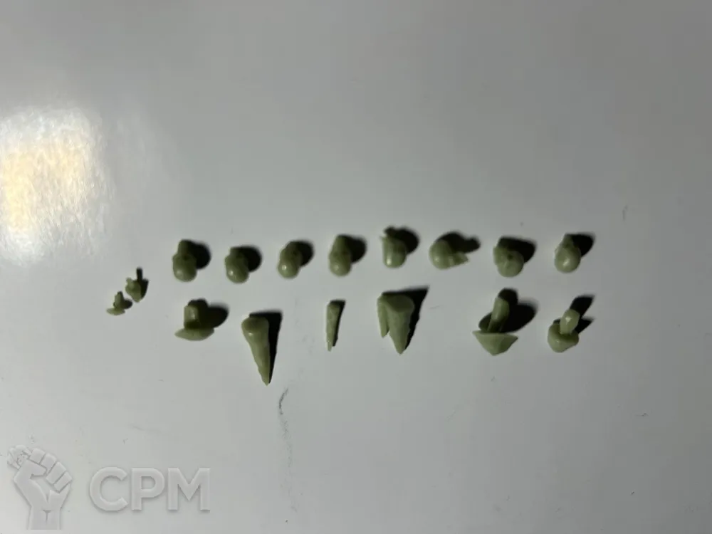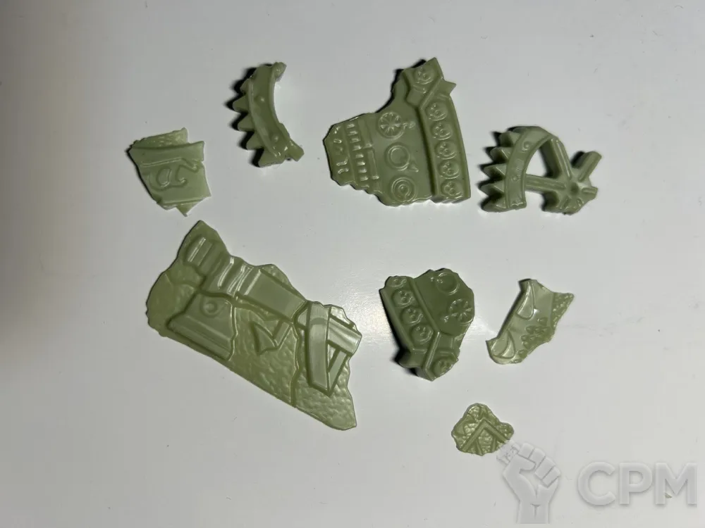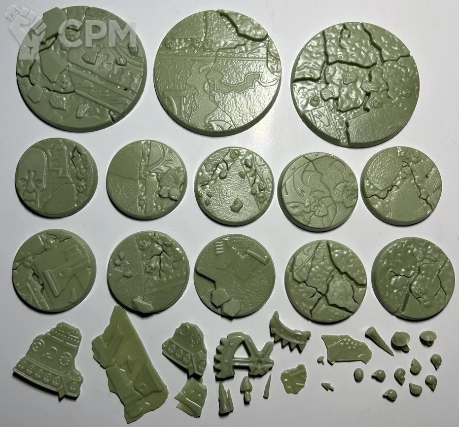 Качество литья весьма уважаемое, материал непривычного зеленоватого цвета но для работы комфортный, классические смещения присутствуют но совсем небольшие, поддержки на литье уже счищены да и облоя почти нет. Плюс продавец подкинул пару мелочей для оформления баз что приятно.