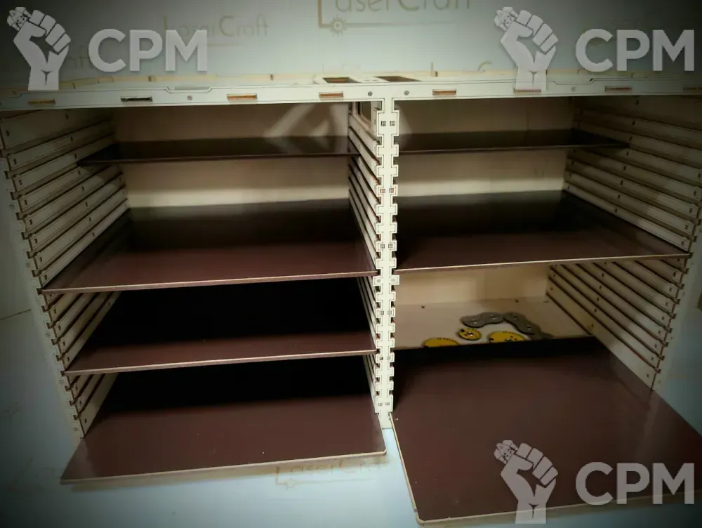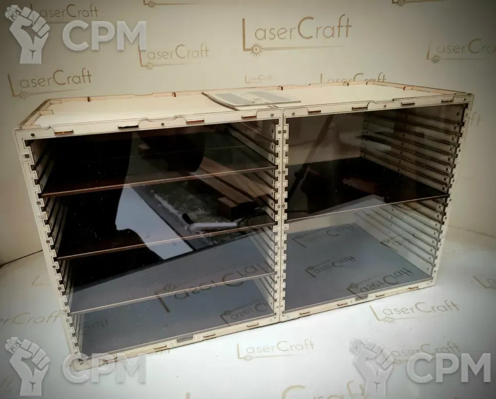 Спасибо большое Олегу за персональные полки под размер маленьких баночек Пасифика, экономит очень много места на столе. Сборка простая, интуитивно понятная, материал - фанера 2 мм, в принципе я думаю если аккуратно собирать то её хватает, за счет лазерной резки зазоров между шипом и пазом по сути нет и надо очень нежно втыкать чтобы ничего не выгнулось и не переломилось. Собранная полка стоит устойчиво, сзади есть две поперечины для жёсткости между боковыми стойками, на верхней есть вырезы для того чтобы повесить на стену. Рекомендую мастера.