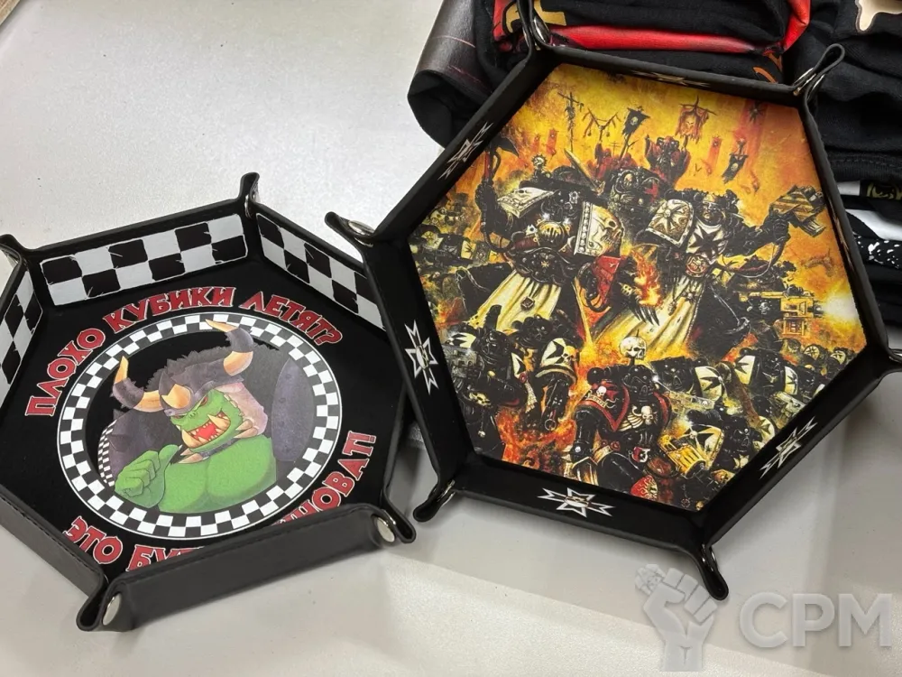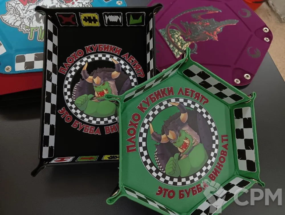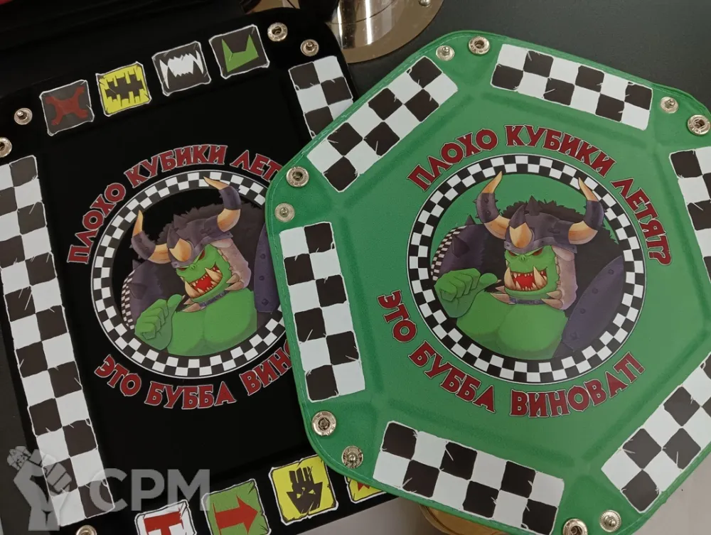 Вельветовый внутренний слой, внешний слой из кожзама. Собирается на заклепках, удобен в транспортировке. Незаменимый аксессуар для регулярных игр в DnD и MTG и вот это вот всё.