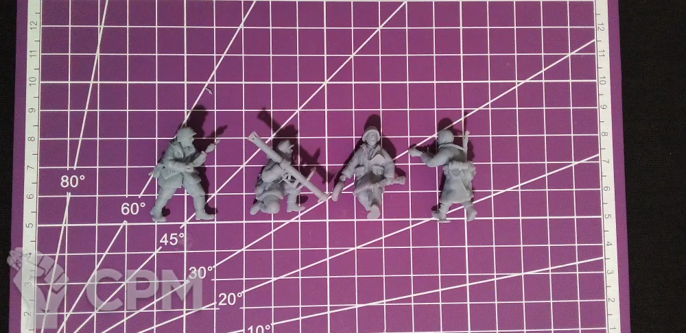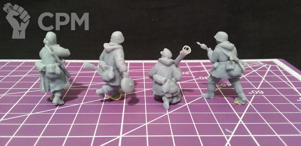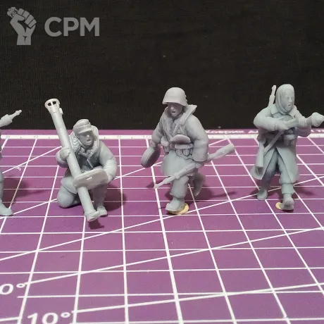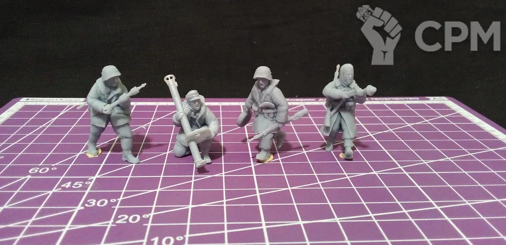 Набор миниатюр немецкой пехоты с противотанковым вооружением в масштабе 1/56 (28мм). Подойдет для варгеймов, либо для творчества (создания виньеток, диорам и т.п.).