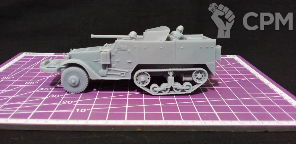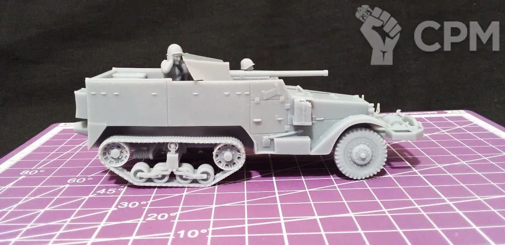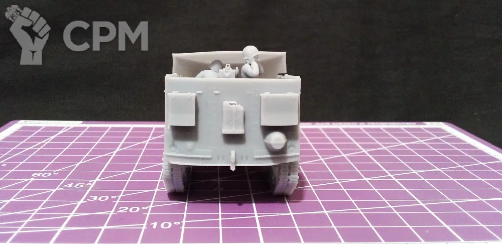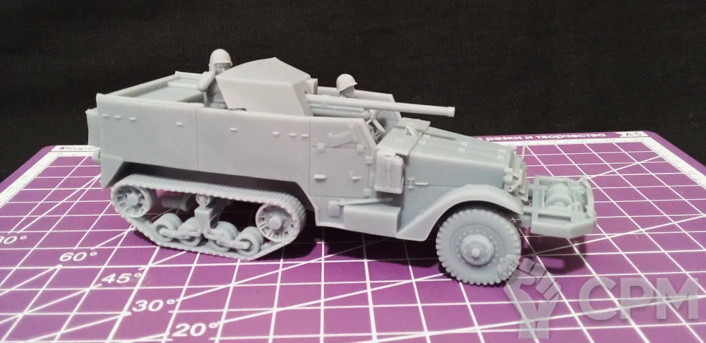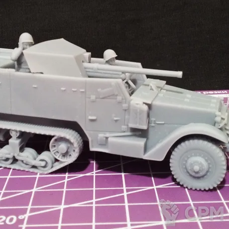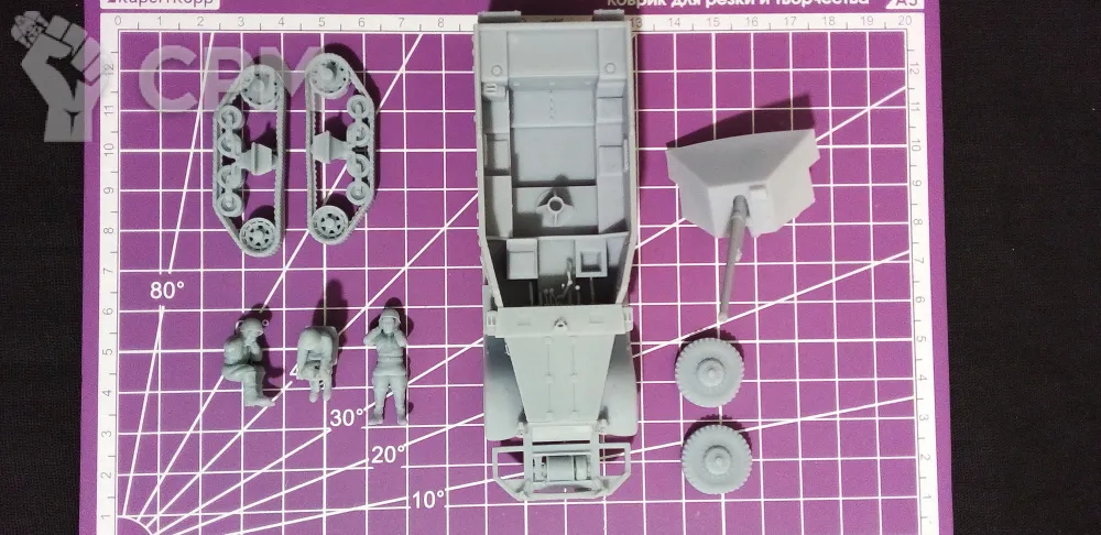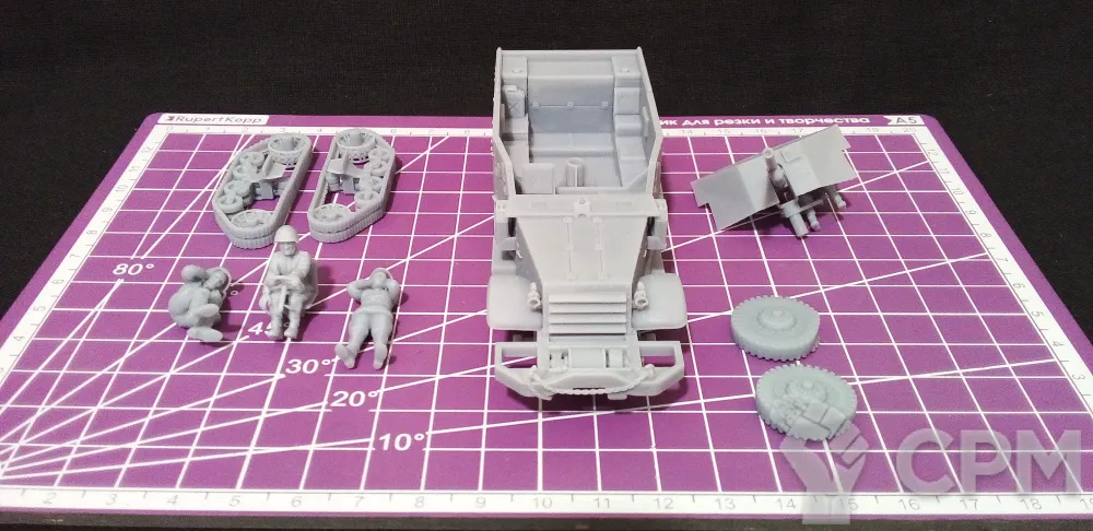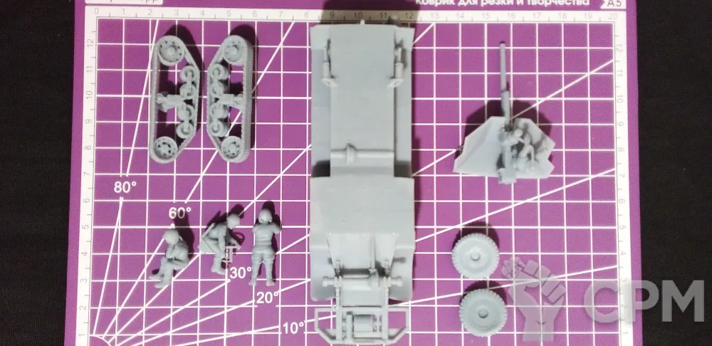 Модель состоит из корпуса, гусениц, колес, орудия со щитом и четырех миниатюр - командира, заряжающего, наводчика (является частью орудия) и водителя. Модель снята с поддержек, промыта и засвечена ультрафиолетом. Могут наличествовать следы от поддержек - аккуратно удалите их модельным ножом, либо шкуркой.