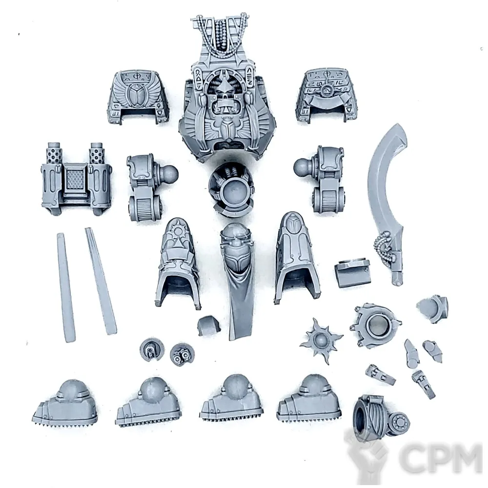 Собакен пришел. На качество литья не буду жаловаться - смола и крупные детали дружат никак. Но недостающие детали - это нехорошо. Точно нет запалов на втором инферно кэнон, нет второй крышки плеча над сервитором, нет одного места крепления силового кабеля к орудию и вызывает подозрения одиночная деталь чьё назначение я пока не нашел.