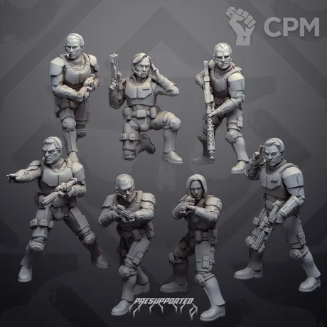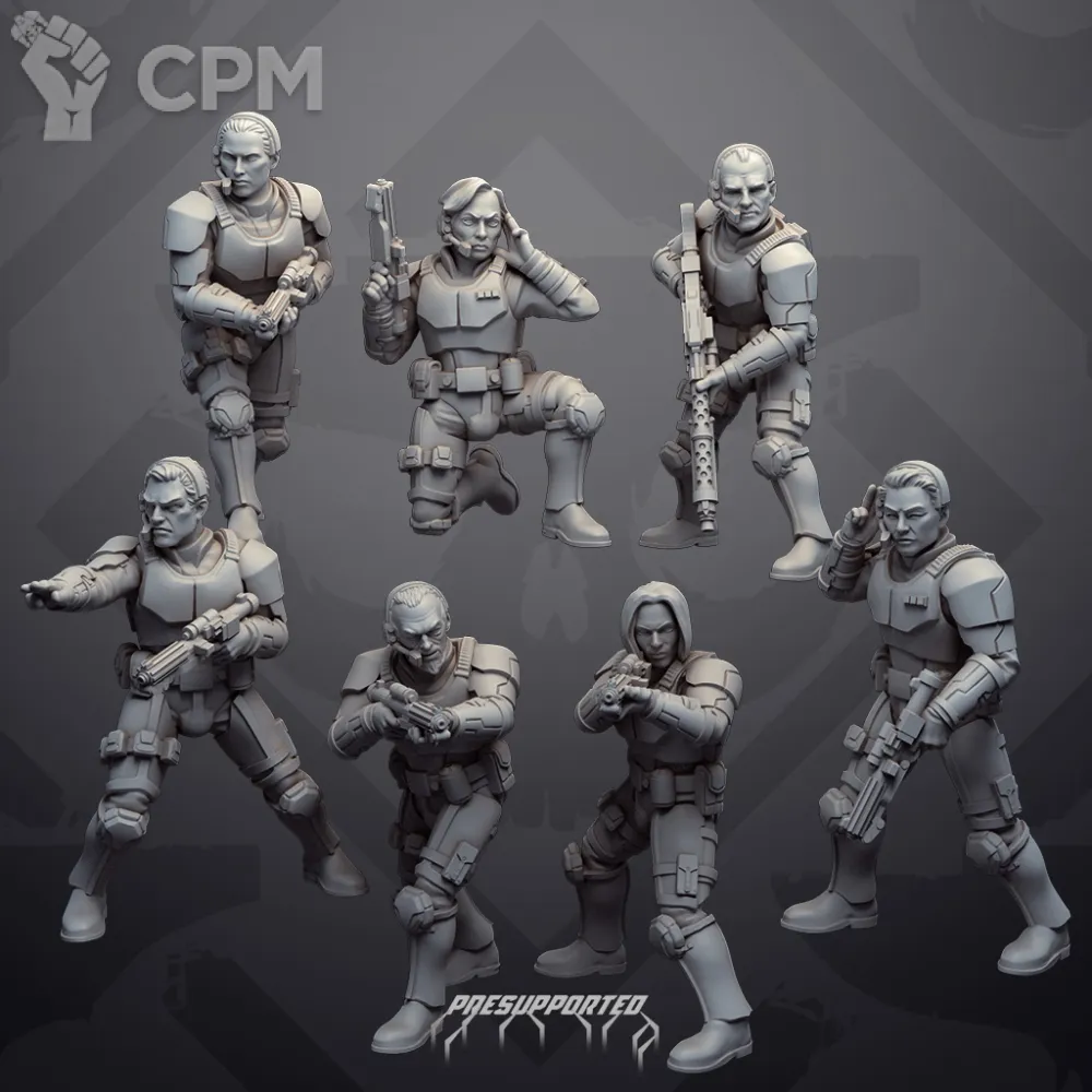 Миниатюры напечатаны на фотополимерном 3д принтере с толщиной слоя в 0.03 мм. В комплекте 7 миниатюр в разобранном виде. Комплект как представлено на фото, возможна печать дополнительных миниатюр или битсов.
