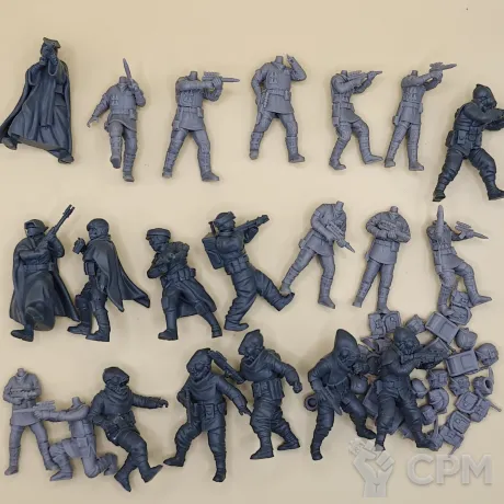 По отряду имперской армии: отряд отлично детализирован и пропечатаны все мелкие детали но есть два небольших косяка у одной миниатюры поддержка напечатана прямо на лице, и есть косяк в печати плаща.