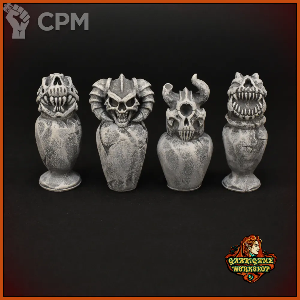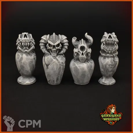 Урны с крышками в форме черепов монстров.