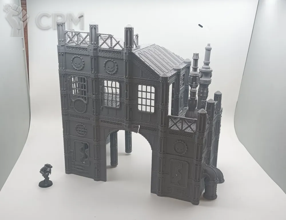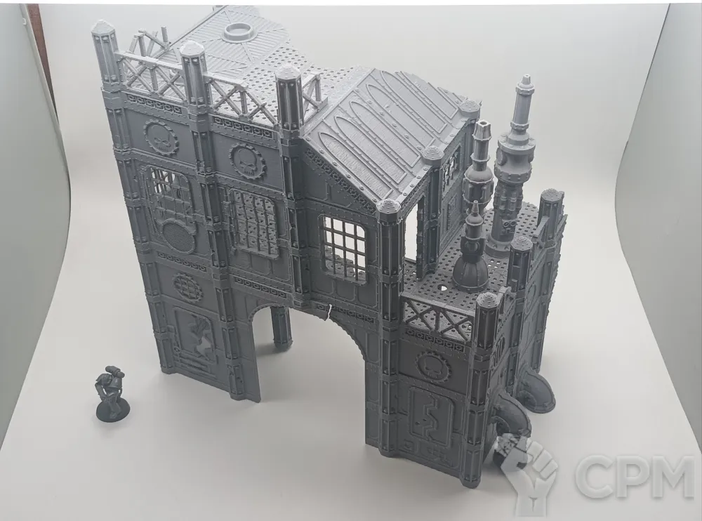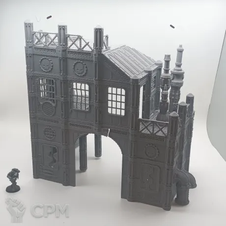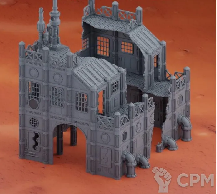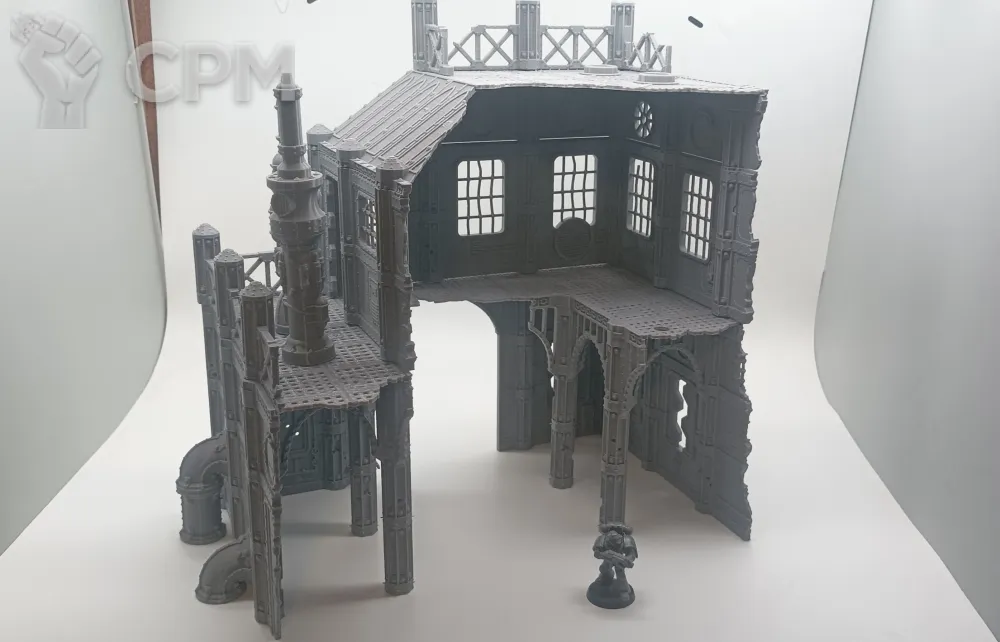Передняя часть большого завода. Для удобства обе части продаются отдельно, так как являются полностью самостоятельными элементами террейна, и могут использоваться как одно большое здание, или несколько руин. На последнем фото изображен завод с обоими частями. Сборка на коннекторах или клеем.