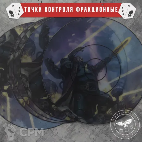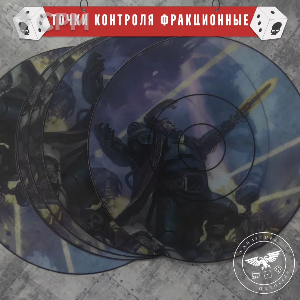 Точки контроля "Фракционные" с рисунком вашей фракции. Состав - 6 точек контроля. Могут находится под руинами и никаких эффектов не будет. Хорошо держатся на столе.