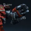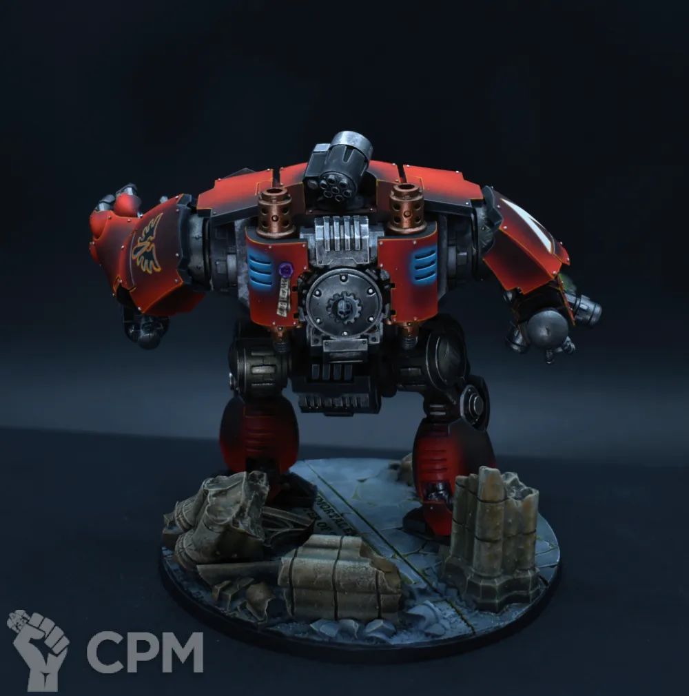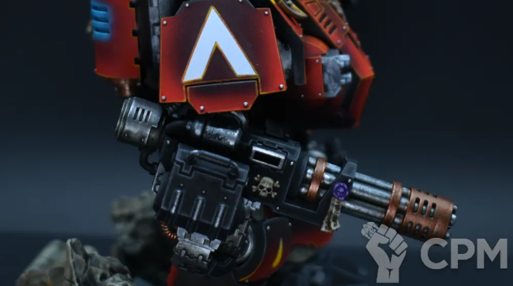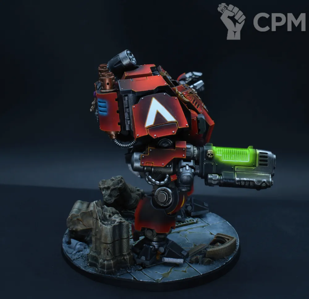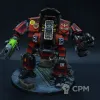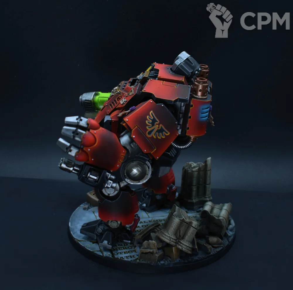Покрас, на самом деле, довольно впечатляющий — уверенный такой игровой. Отдельно хочется похвалить за лицо, то есть руну Кхорна, которую лично я б умаялся прокрашивать. Хорошие контуры, хороший шлем на пике, хороший плащ. Единственное, что по моему субъективному мнению, жёлтые трубки на ранце как будто жирноваты и несколько выбиваются из общей картины, но это мелочь. В общем — класс, мне понравилось искренне.