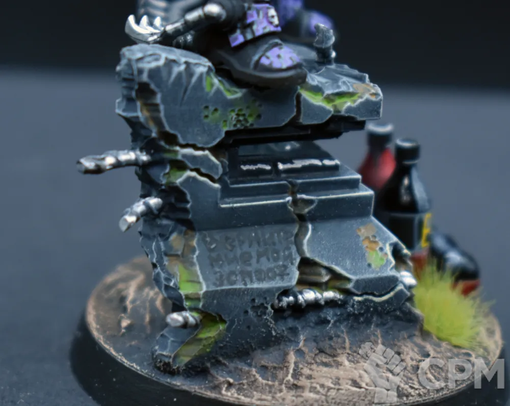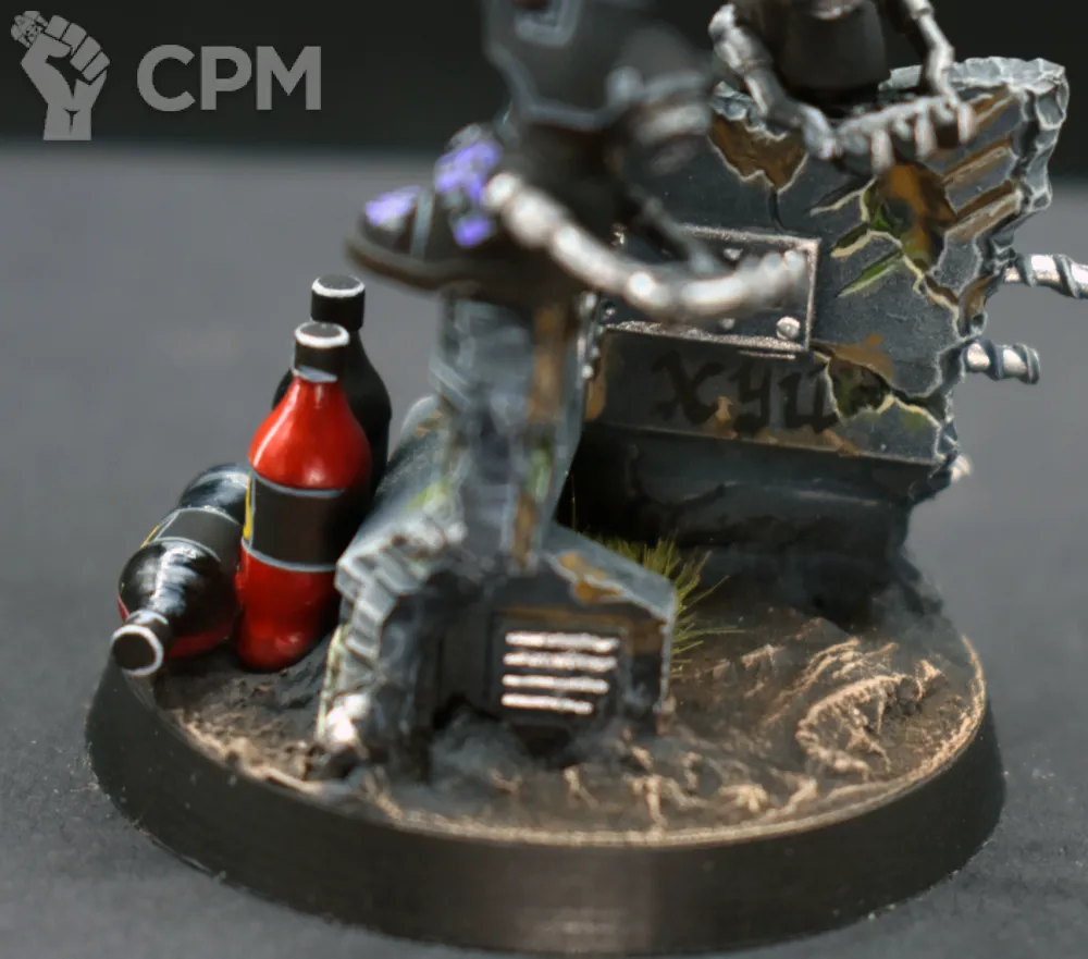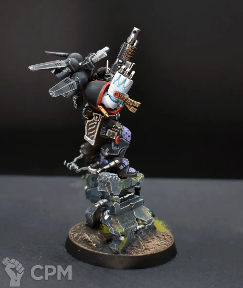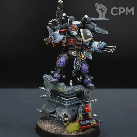 Покрас, на самом деле, довольно впечатляющий — уверенный такой игровой. Отдельно хочется похвалить за лицо, то есть руну Кхорна, которую лично я б умаялся прокрашивать. Хорошие контуры, хороший шлем на пике, хороший плащ. Единственное, что по моему субъективному мнению, жёлтые трубки на ранце как будто жирноваты и несколько выбиваются из общей картины, но это мелочь. В общем — класс, мне понравилось искренне.