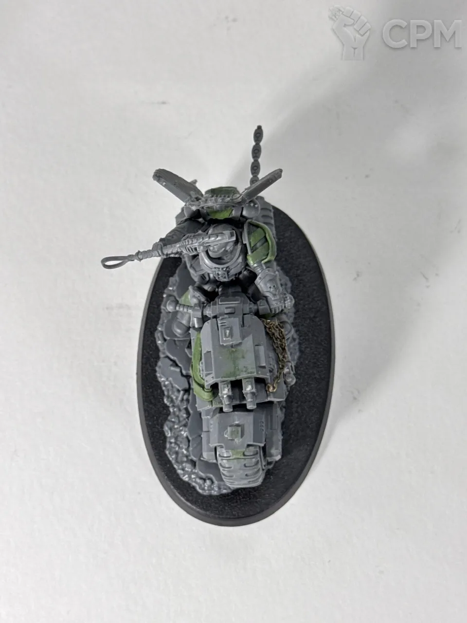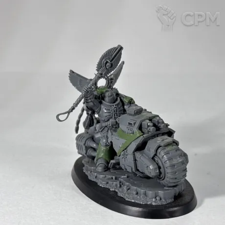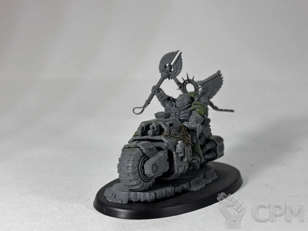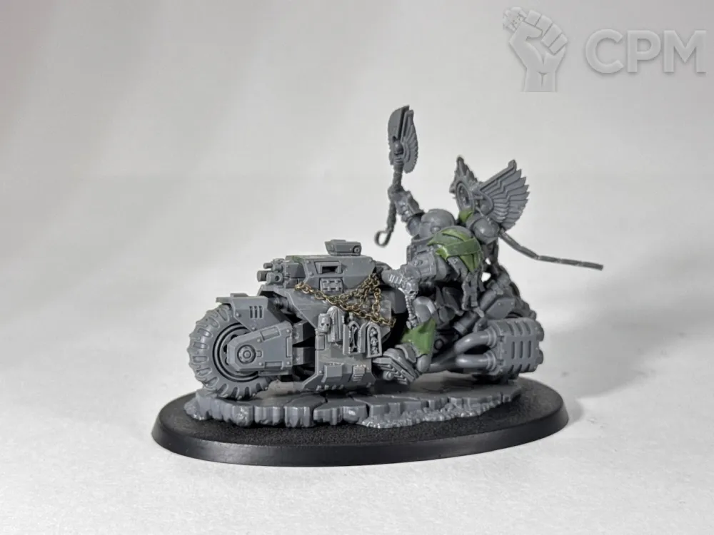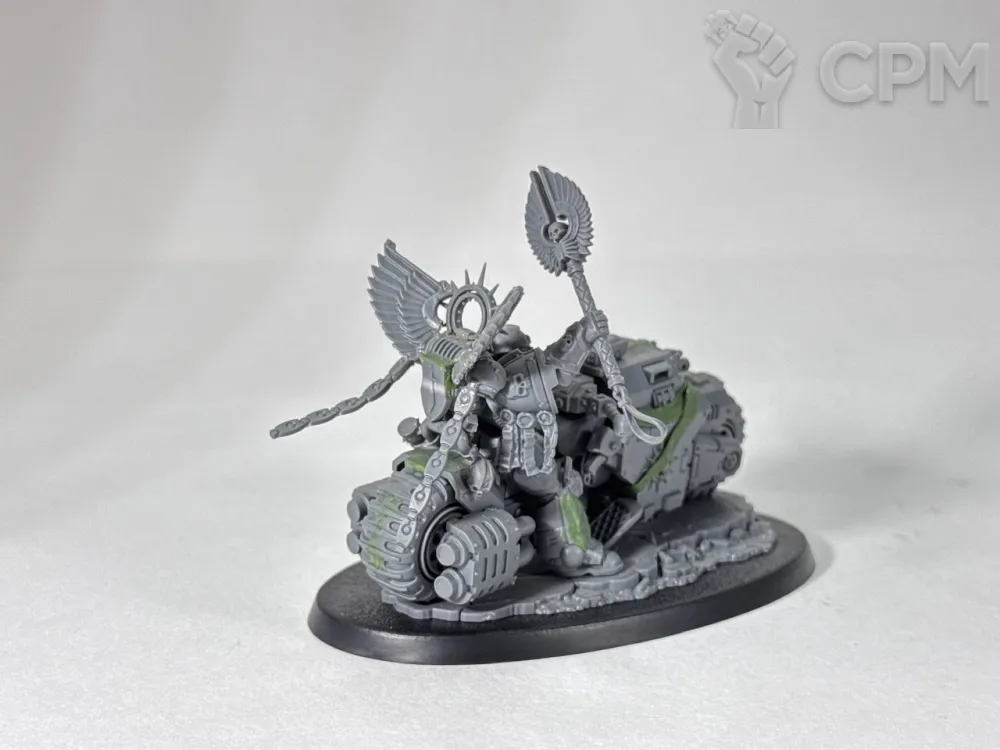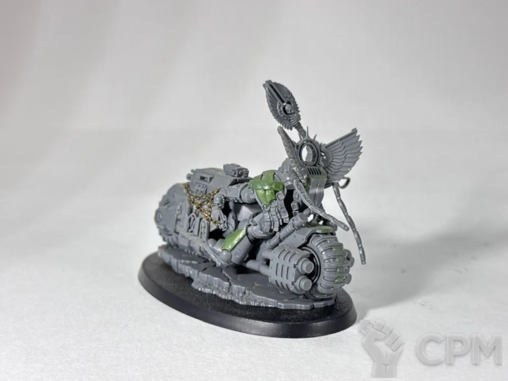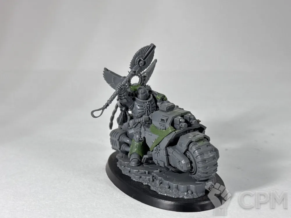 Примарис капеллан на байке, оригинальный ГВшный пластик, как сама миниатюра, так и использованные на минорный китбаш некронские битсы и крылья вексилл. Лепнина - green stuff, цепи от Green Stuff World, металл.