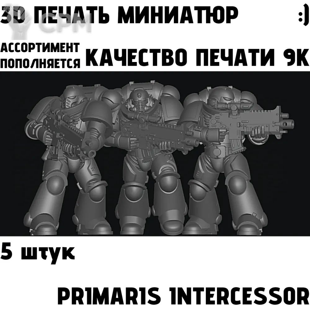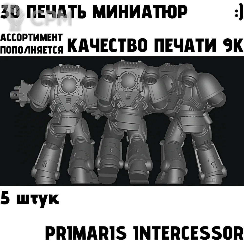 3D печать пяти миниатюр Primaris Intercessor, комплектация базовая.