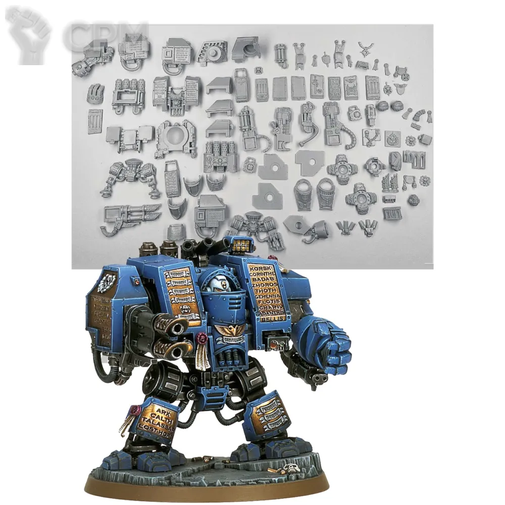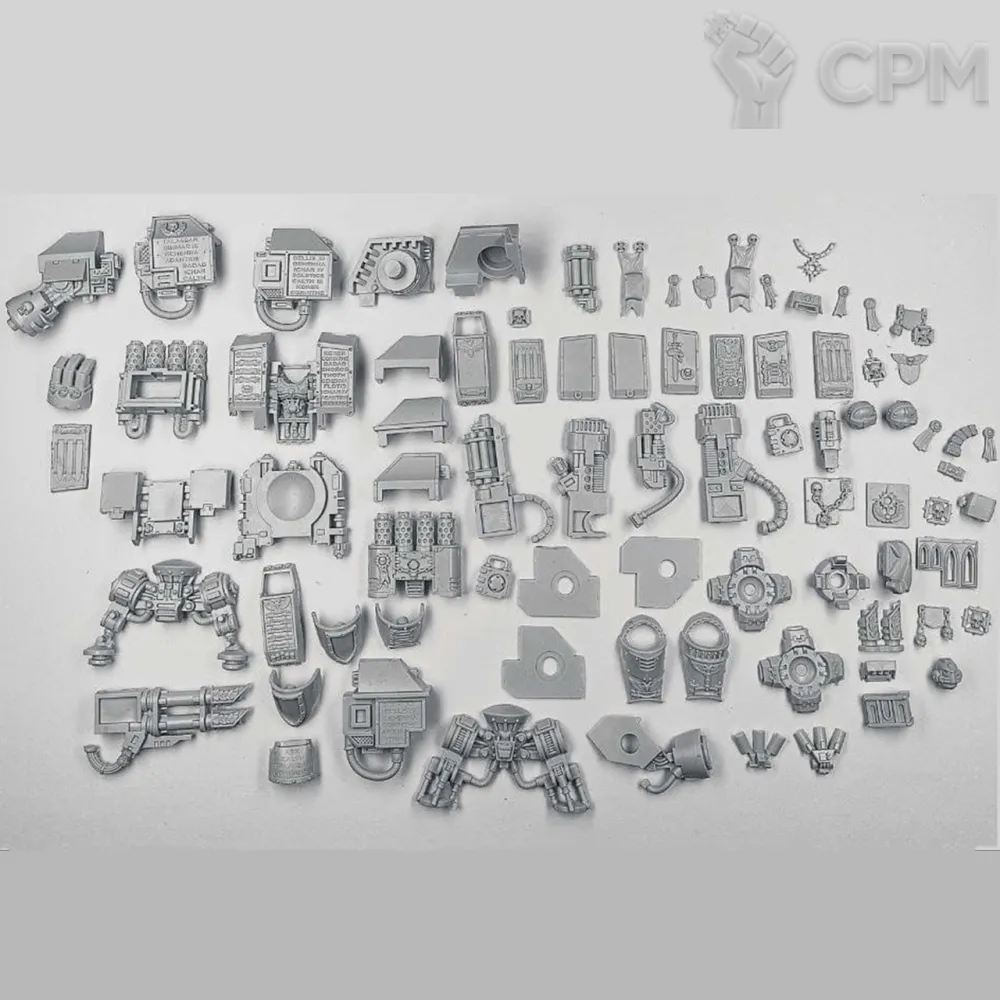 Собакен пришел. На качество литья не буду жаловаться - смола и крупные детали дружат никак. Но недостающие детали - это нехорошо. Точно нет запалов на втором инферно кэнон, нет второй крышки плеча над сервитором, нет одного места крепления силового кабеля к орудию и вызывает подозрения одиночная деталь чьё назначение я пока не нашел.
