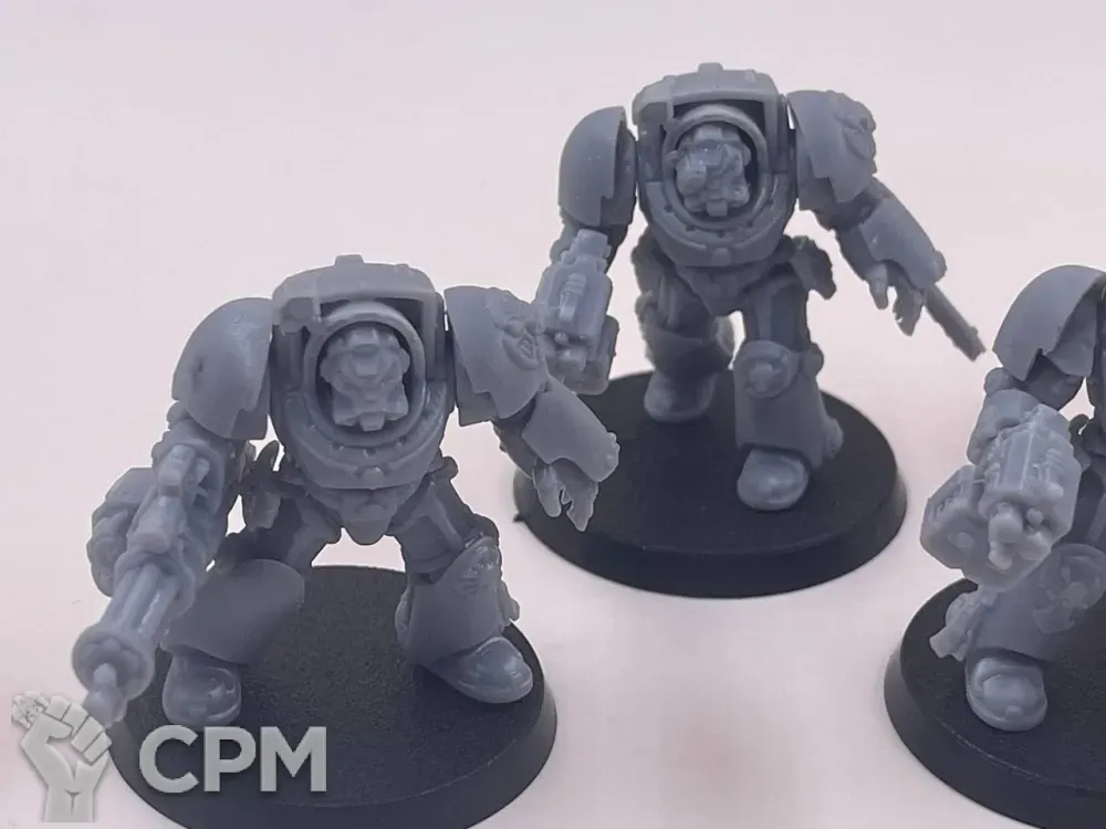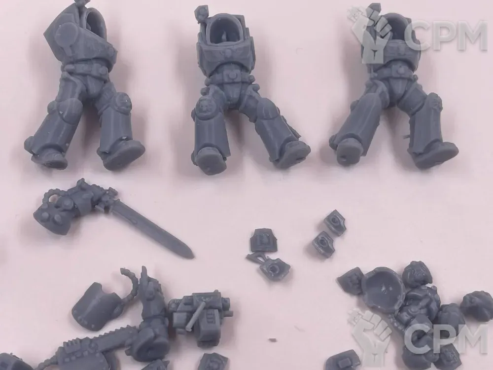 Литье варьируется от отличного до плохого. Толстые каналы для заливки на самых видных местах хелбластеров - сверху ворота, внешней стороны наплечника, удалить бесследно не получится. Есть заметные пузыри, непроливы, две марские тушки будто поплавило. Ощущение, будто к удачной партии примешали брак. Баз в комплекте нет, отправил быстро, упаковка хорошая.
