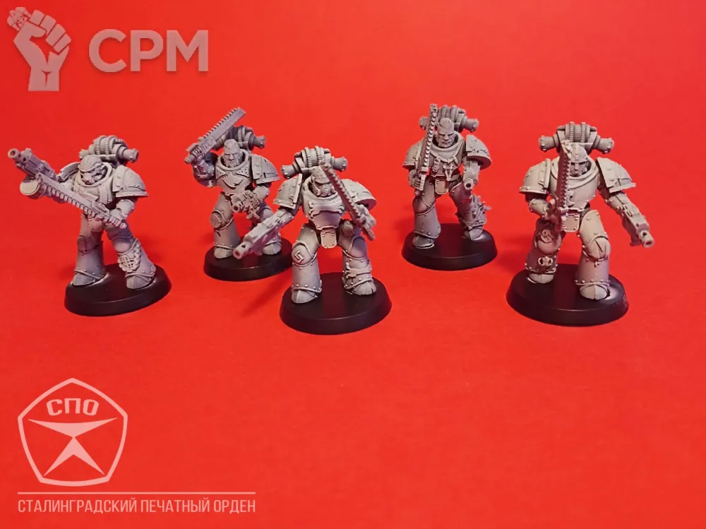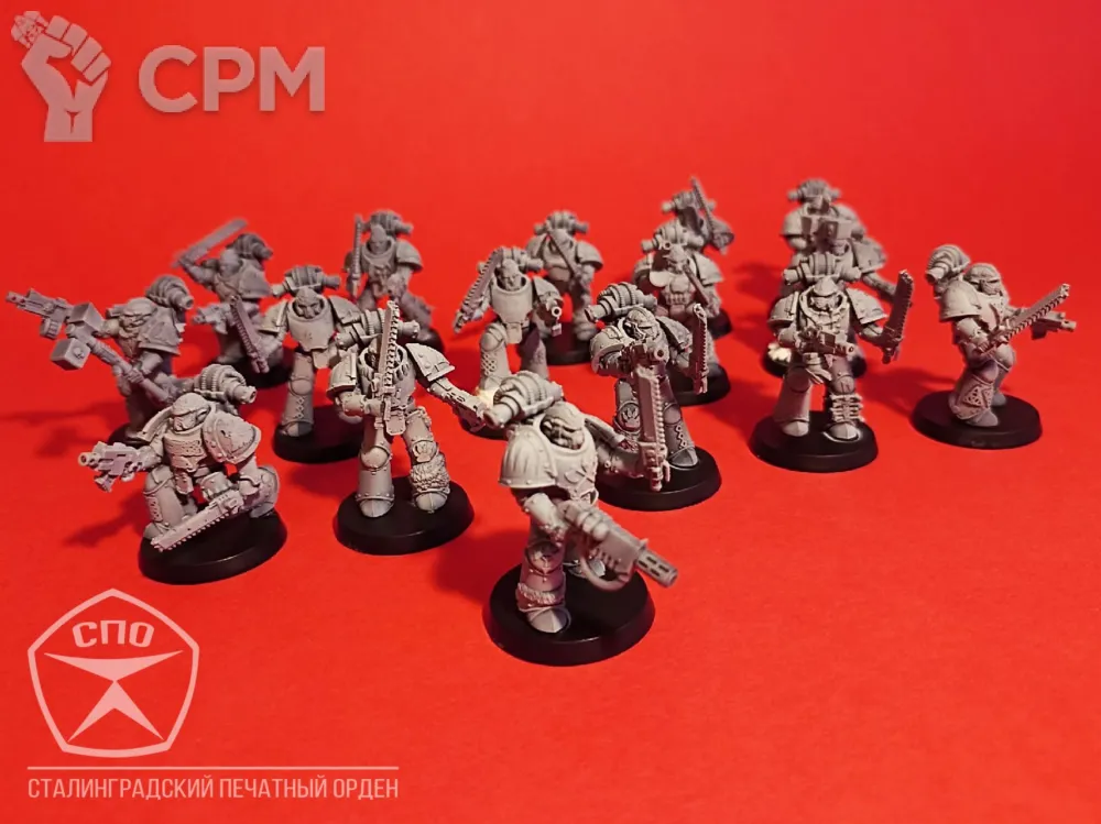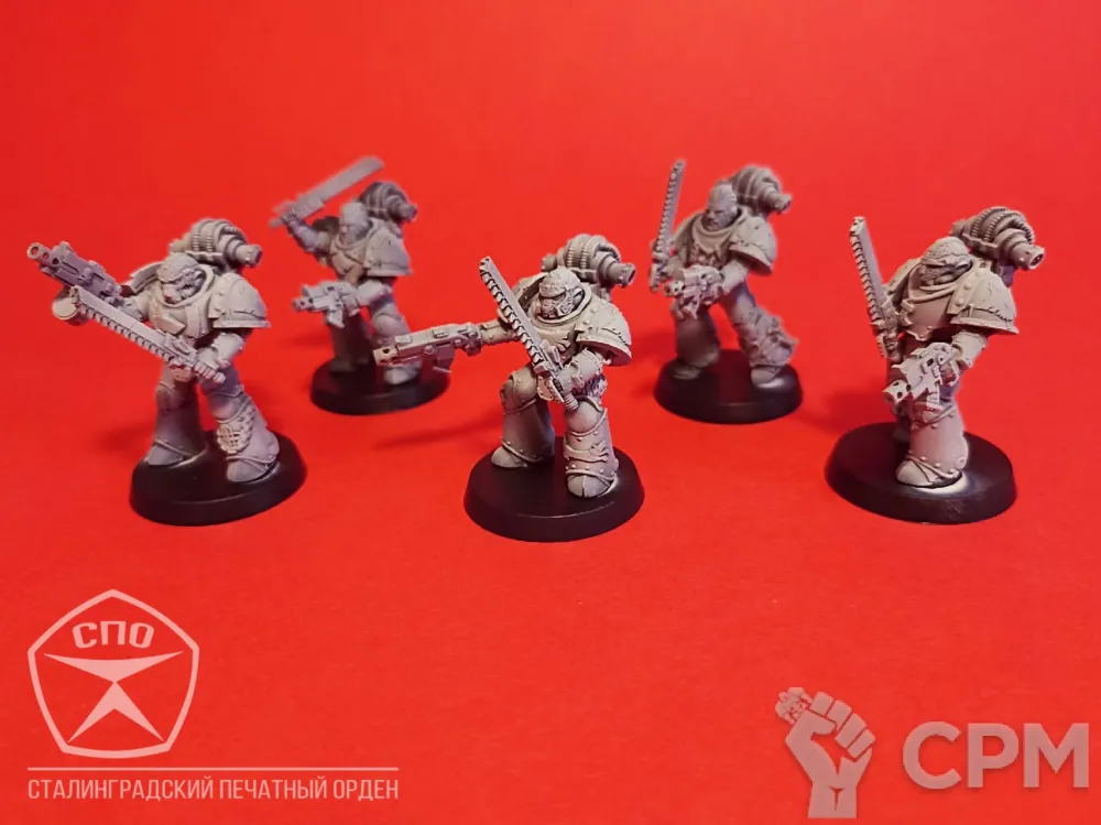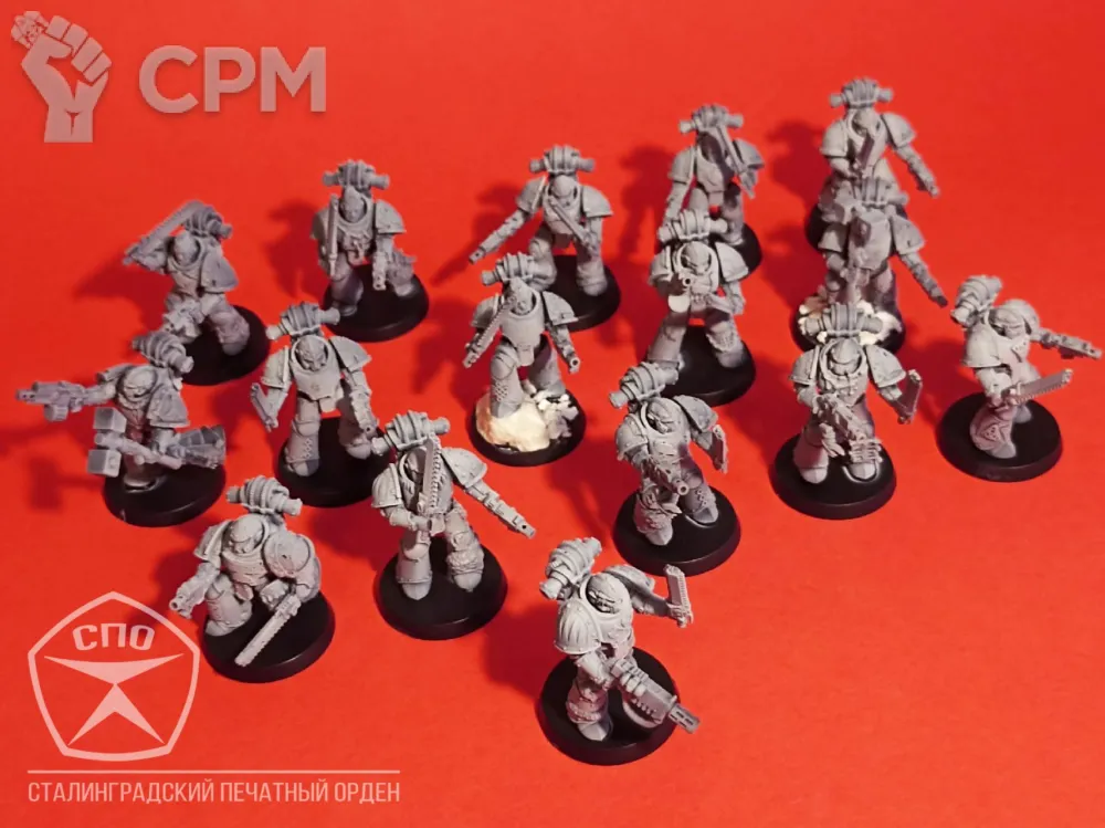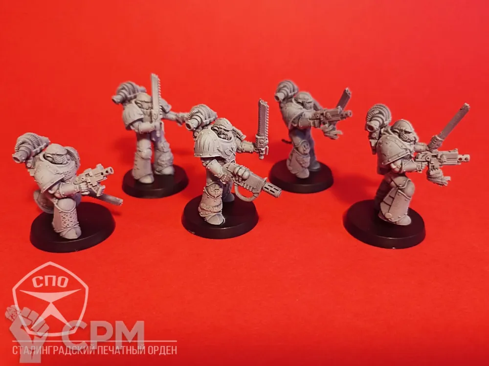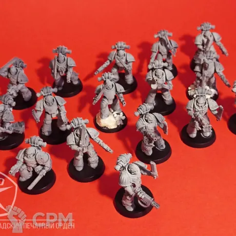 Пехота Космических Волков. Броня МК 3, времён Ереси Хоруса, позволит вам пополнить ими любую армию - 30к или 40к. Раздельная компоновка позволит собрать весь отряд в индивидуальных позах, закачки и вооружение обсуждаемы, по умолчанию - болтеры/пистоли и пиломечи. Модели комплектуются подставками, цена за 16 моделей.