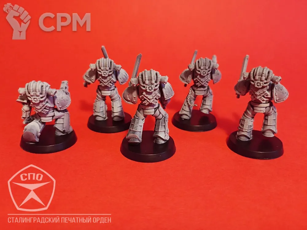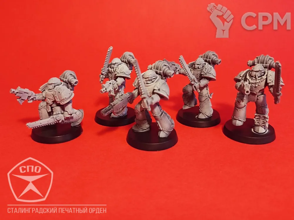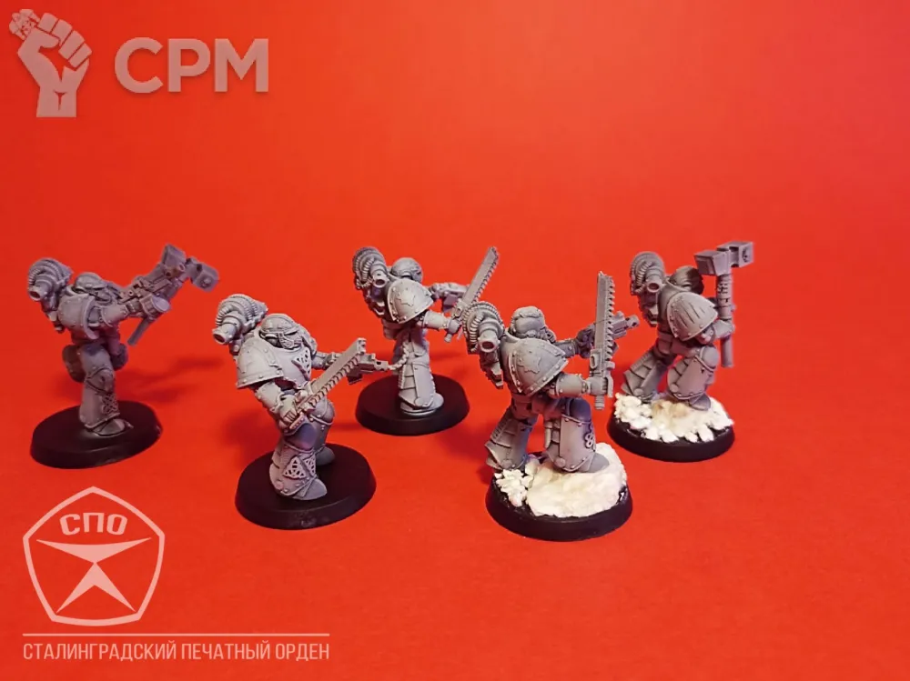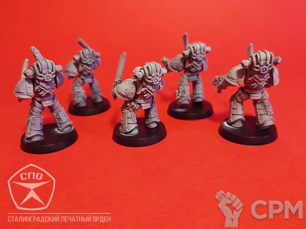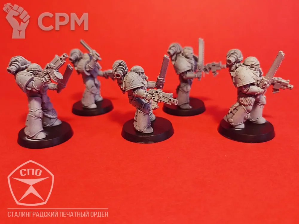 Пехота Космических Волков. Броня МК 3, времён Ереси Хоруса, позволит вам пополнить ими любую армию - 30к или 40к. Раздельная компоновка позволит собрать весь отряд в индивидуальных позах, закачки и вооружение обсуждаемы, по умолчанию - болтеры/пистоли и пиломечи. Модели комплектуются подставками, цена за 16 моделей.