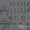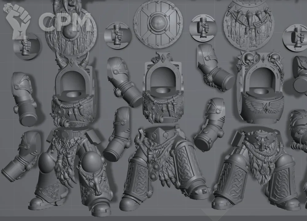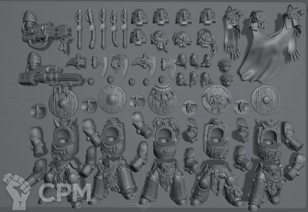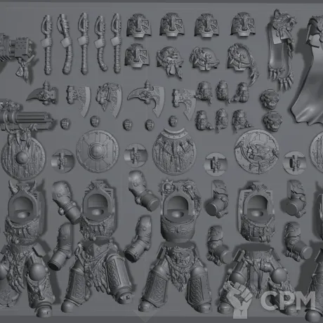 Набор для сборки пяти "терминаторов" Волчьей стражи. Пять пар ног, пять тел, 10 наплечников, 10 голов, штурмовая пушка, пять штурмовых щитов, тяжёлый огнемёт, четыре топора, силовой молот. двенадцать рук, пять правых кистей.