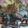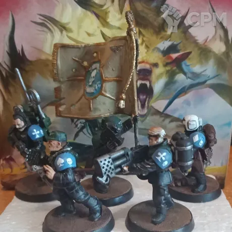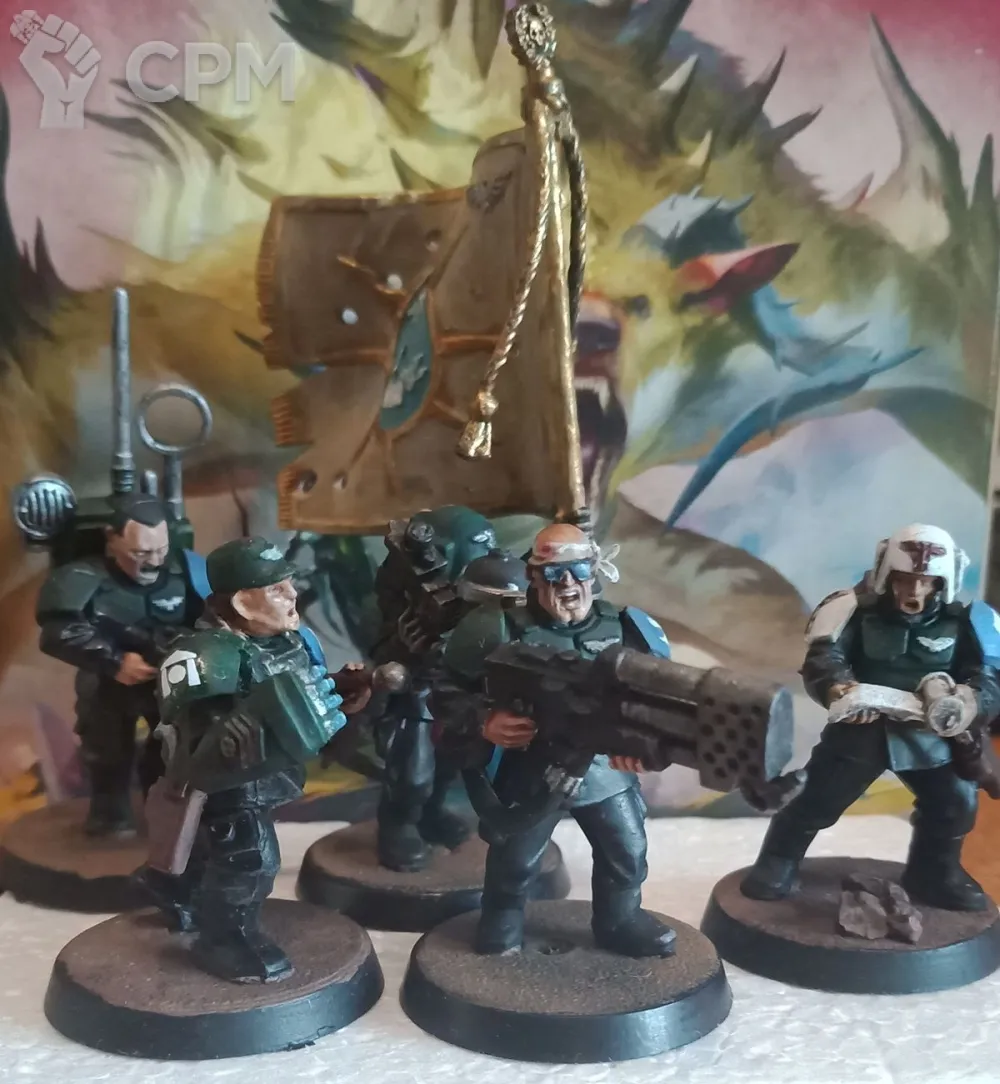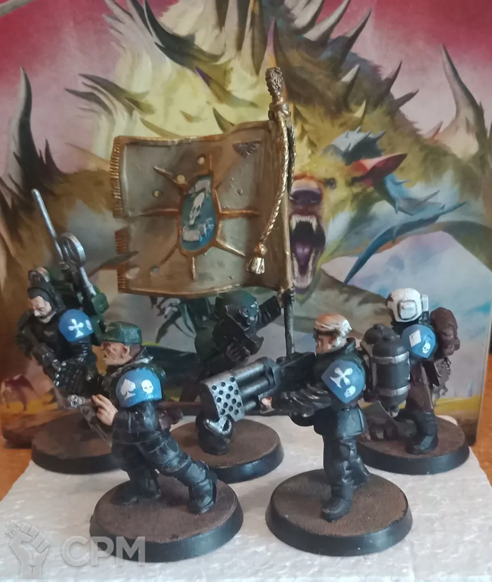 Оригинальный пластик, но детали от разных наборов. Офицер с силовым кулаком, медик, знаменосец, радист, огнемётчик. Самая простая игровая покраска, но свежая и аккуратная - бери и в бой. После докраски не использовались . Форма на фигурах темнее стандартной. Маркировка на наплечниках частично наклейки частично рисование от руки.
