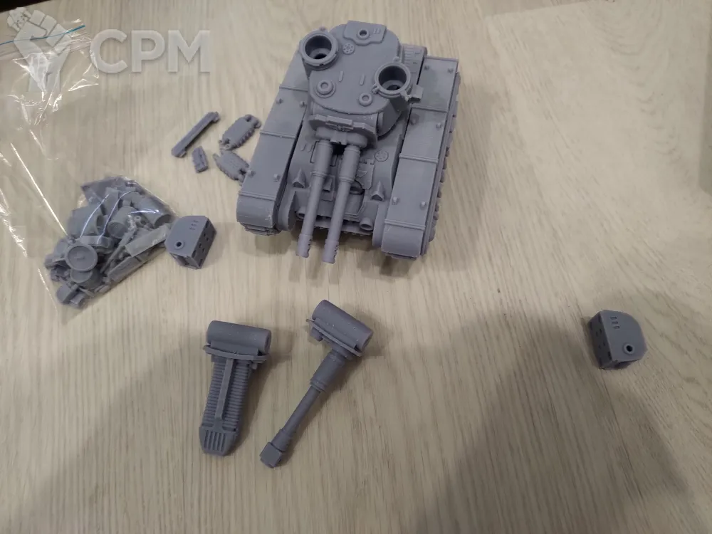 Танк приехал очень хорошо упакованный. Весь корпус был напечатан цельной деталью, всё остальное напечатанно отдельно. Стоит заметить, что нигде нет аквилы, а некоторые оружия (Икарус и хеви стабер) отличаются от оригинала, но тем не менее все закачки есть.
