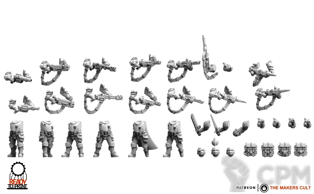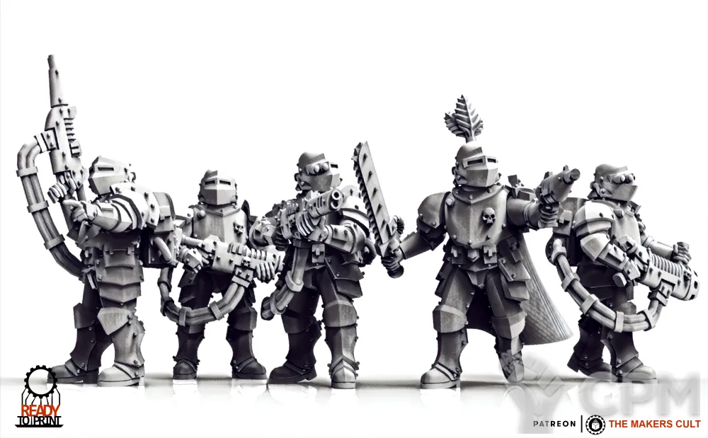6 моделей. Альтернативные сционы для феодальной гвардии. В комплекте оружие для сержанта, 2 гранатомёта, 2 плазмы, 2 мельты, 2 огнемета, 2 воллигана, 4 хотшот лазганов. Можно дополнить тушками до 10 моделей.