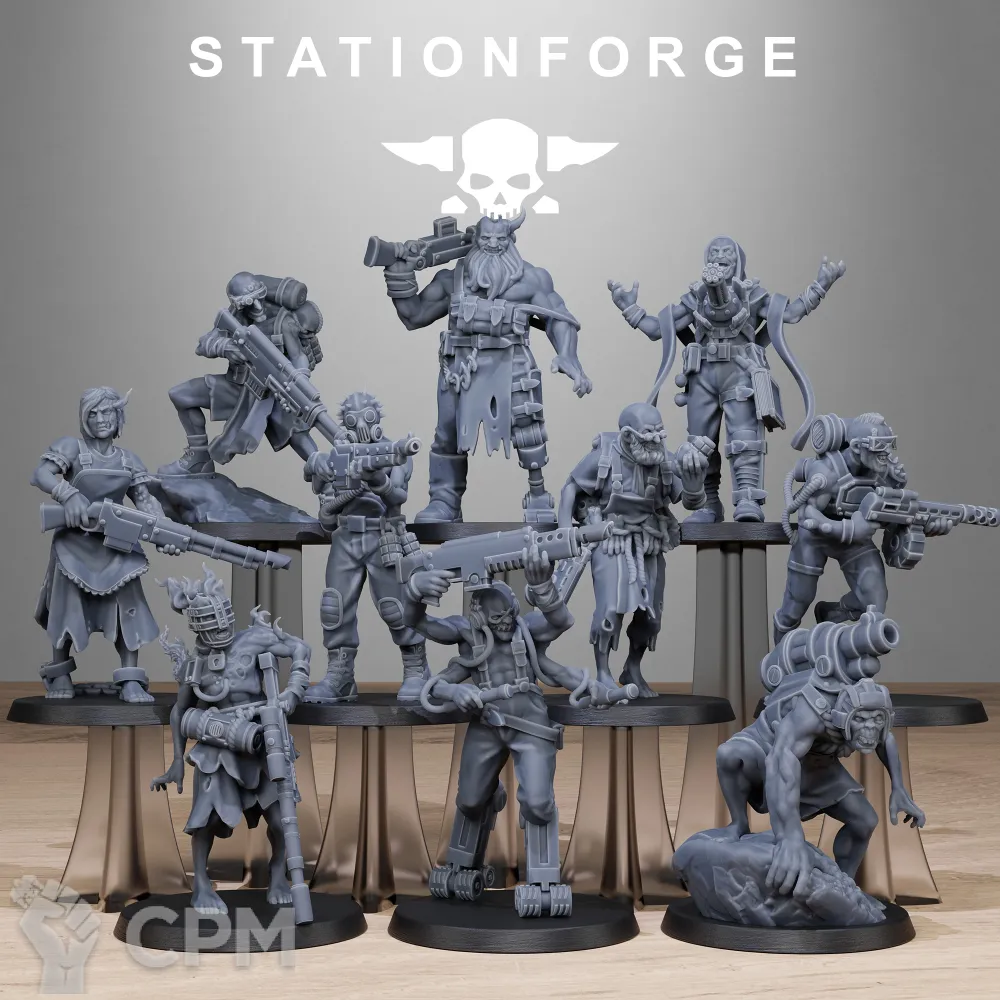 60 зомби! Базы в комплекте, но не приклеены - идут отдельно. Имхо это хорошо, проще нанести текстуру. А еще базы полнотелые. Под магниты придется сверлить, но зато в них есть вес! Поддержек не много.