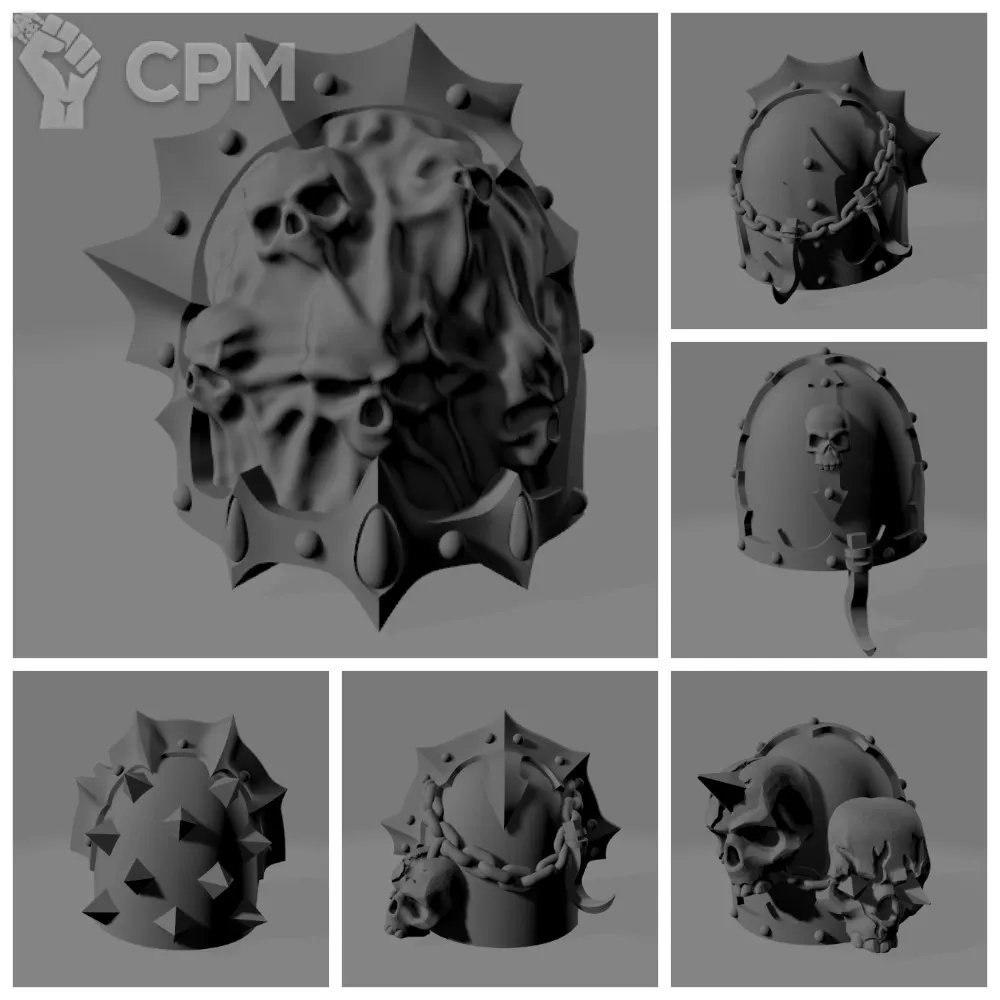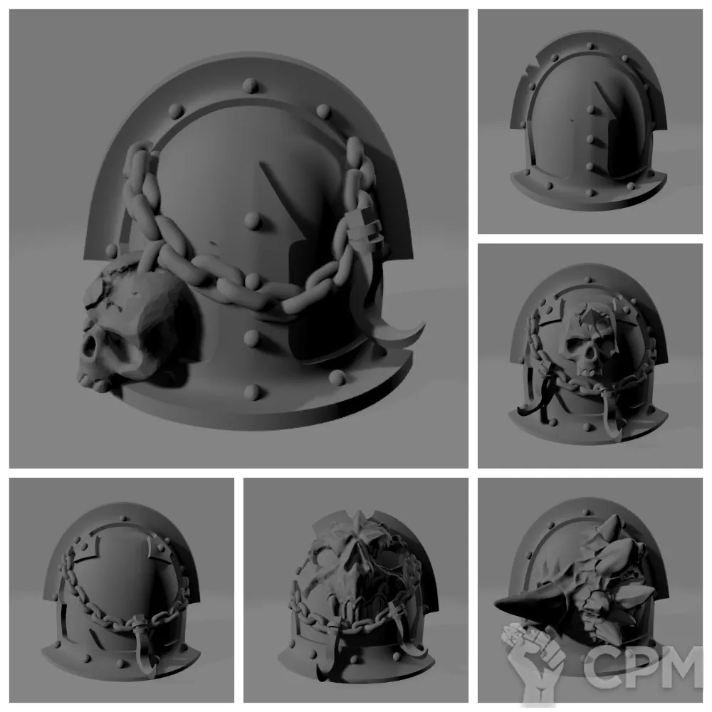 В комплект входят 12 уникальных наплечников для вашей банды Десантников Хаоса и знамя, или штандарт, или... В общем, кусок тела в доспехах, который будет таскать ваш знаменосец. Если вам не нужен весь комплект, а только некоторые из наплечников, то так тоже можно, для этого нужно только связаться с нашим интендантом. Доставка из нашего схрона в любой уголок галактики.