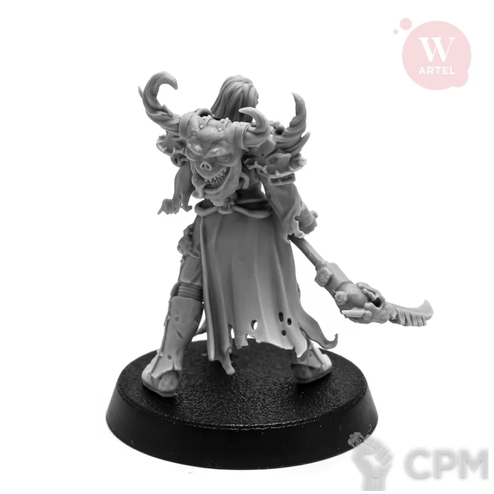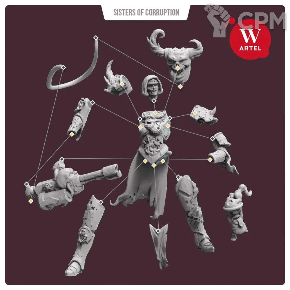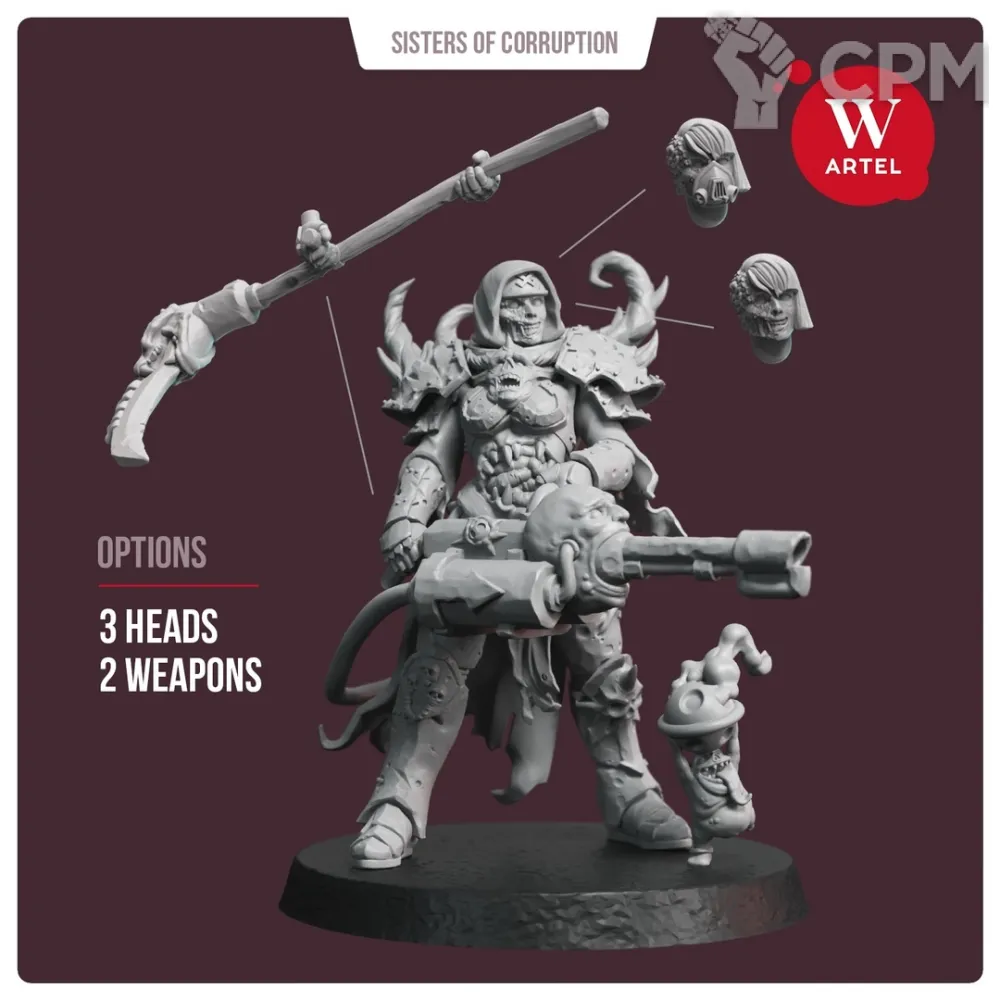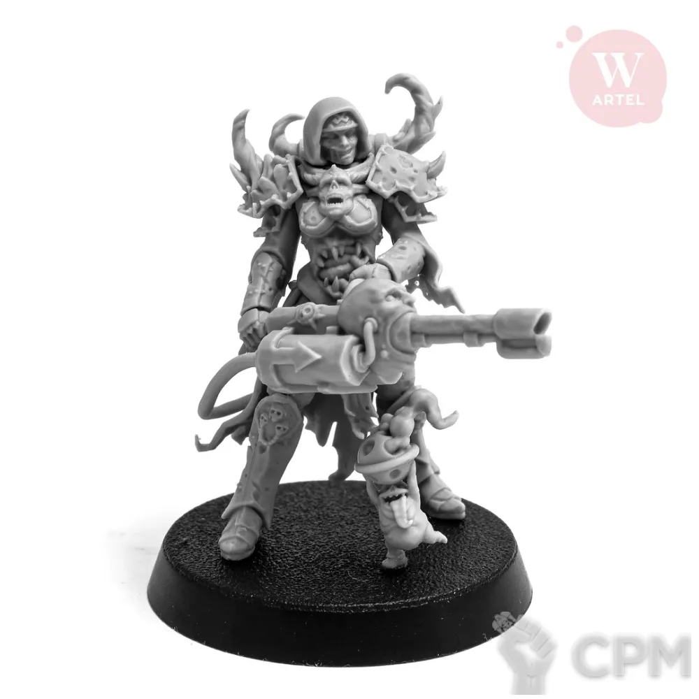 В комплект входят 16 деталей, в том числе: - 3 варианта головы ("обычная", в капюшоне и без капюшона с респиратором), - 2 варианта вооружения (огнемет или коса), - мелкий бес с кадилом - подставка 32 мм.