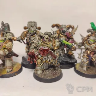 6 литых героев, в том числе тифус, часть руки утеряна, пытался сделать зеленкой, не получилось, лорд оф кондратейшн (подставка кривая с зеленкой), лорд оф вилуренс, талллиман и 2 биологус путрифаера