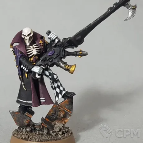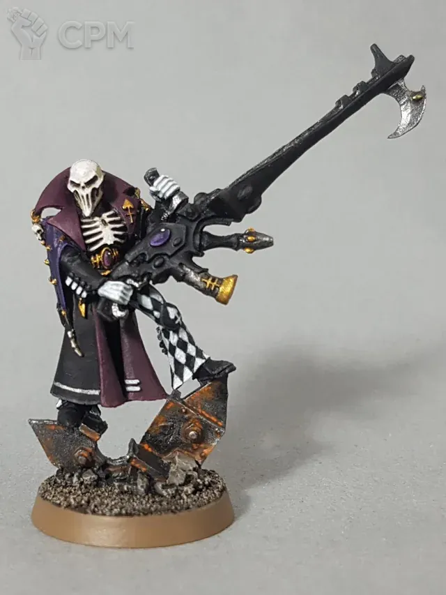 Death Jester — это квинтэссенция эльдарского чувства юмора, если под «юмором» понимать мрачный абсурд, завернутый в бархат и кружева. Вот он скользит по полю боя, этот печальный паяц с Solitaire weapons, будто сама Смерть решила нарядиться для карнавала и теперь слегка смущена собственным выбором костюма. Его движения грациозны, поза — меланхолична, а оружие... о, это не просто оружие, это музыкальный инструмент, играющий симфонию гибели для избранной аудитории.
