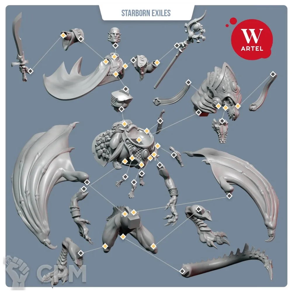 В комплект входят 36 деталей, в том числе: - 2 правых руки (пустая и с мечом) - 3 левых руки (посох, копьё и пустая) - 2 варианта головы - 2 магазина для винтовки - опциональные крылья для дракона - подставка 60mm