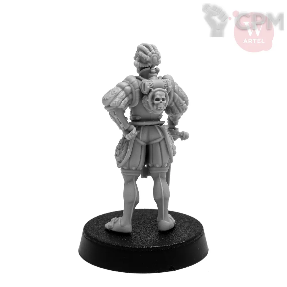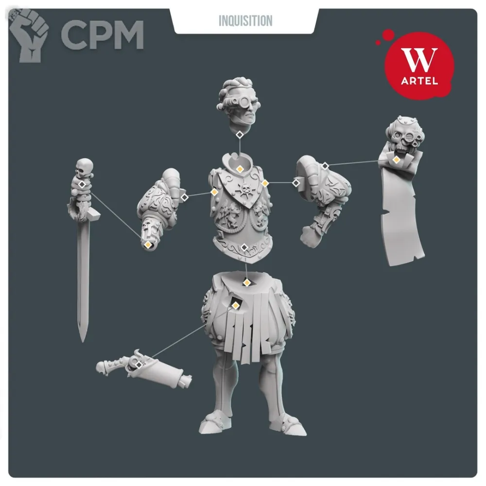 В комплект входят 9 деталей, в том 2 варианта опций для правой кисти - меч/трость; череп-глашатай так же опционален; подставка 25мм.