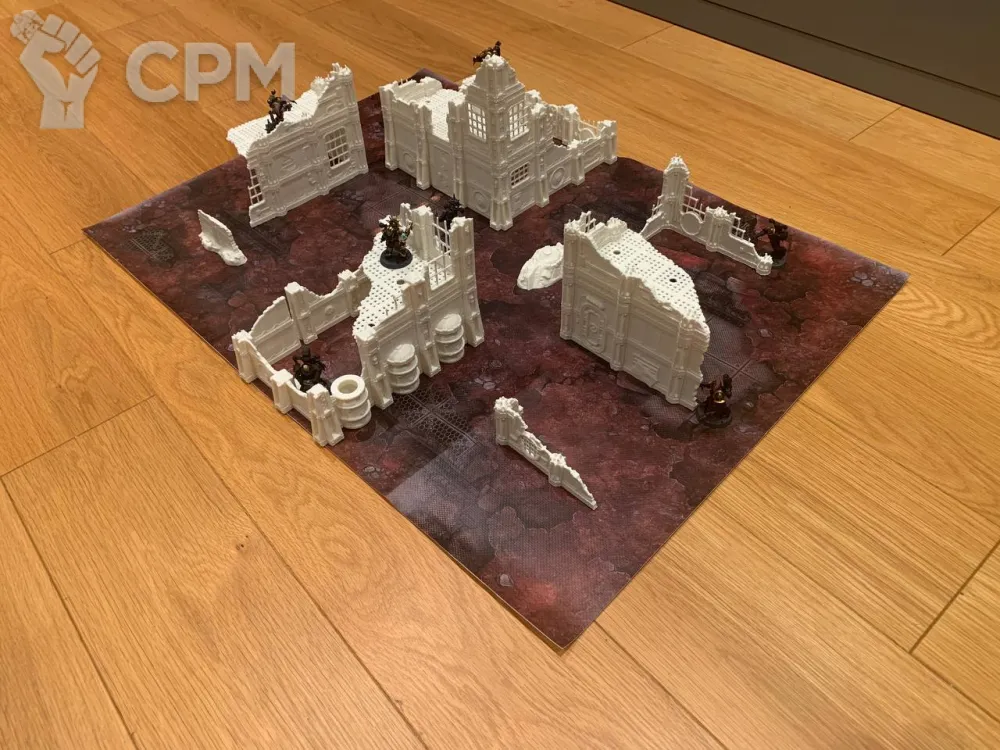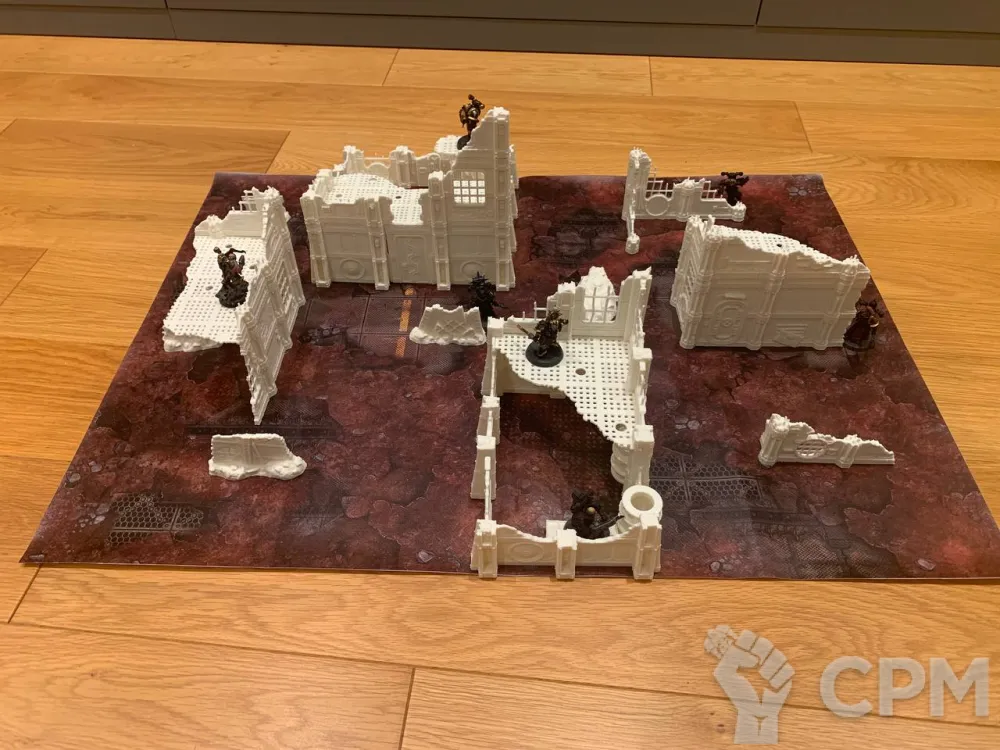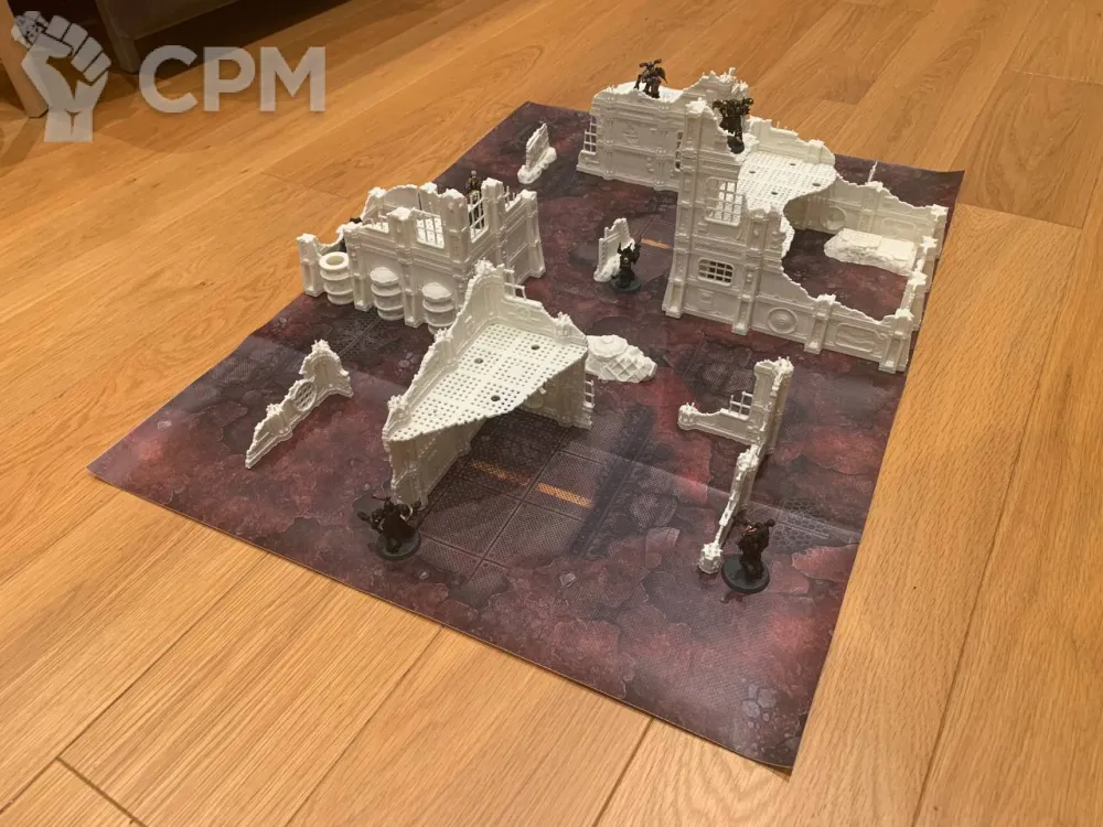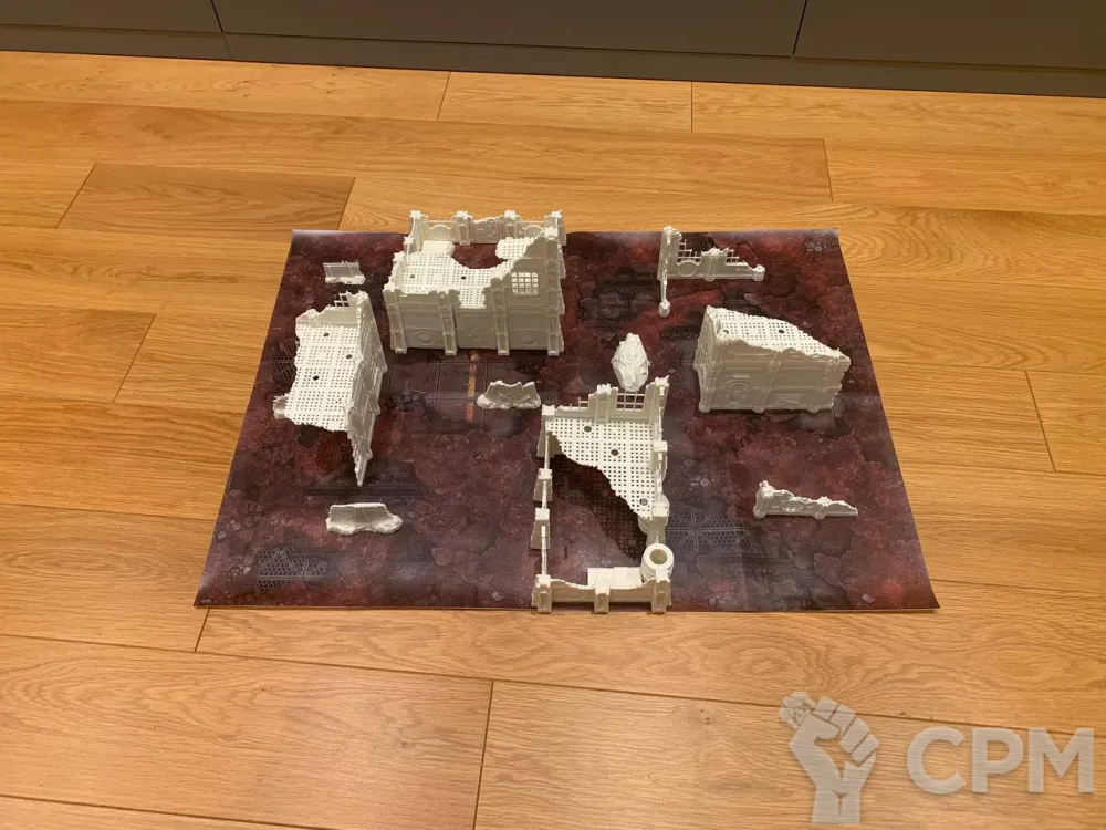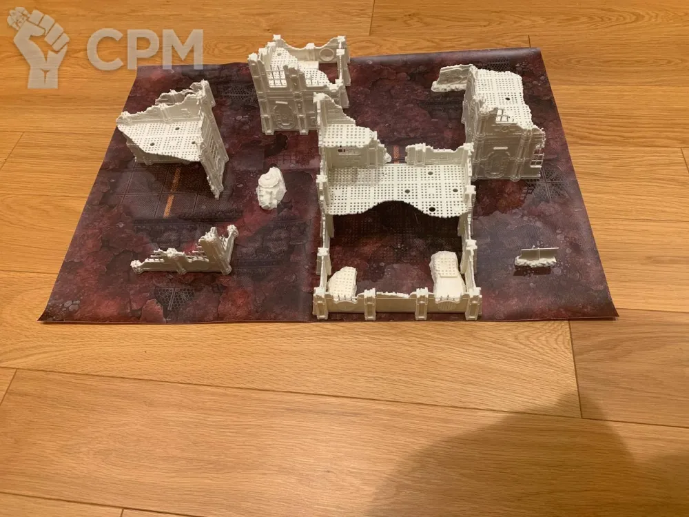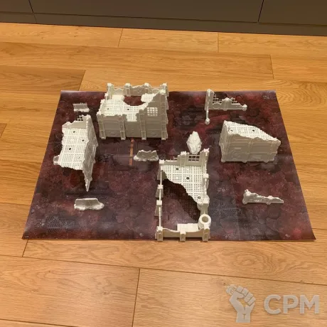 Комплект террейна Vlokus напечатанный на 3д принтере + батлмат 30х22 дюйма. Батлмат односторонний на литом банере. Террейн не в сборе, стенки собираются через "штырьки" (последнее фото), полы вставляются в паз. У полов и стен есть взаимные посадочные места под магниты. Террейн можно склеить, можно оставить в разбираемом виде для удобства транспортировки. На фотографиях террейн просто собран без ничего. Цвет белый - родной цвет пластика, под покрас. Имеются незначительные дефекты печати, которые легко правятся.