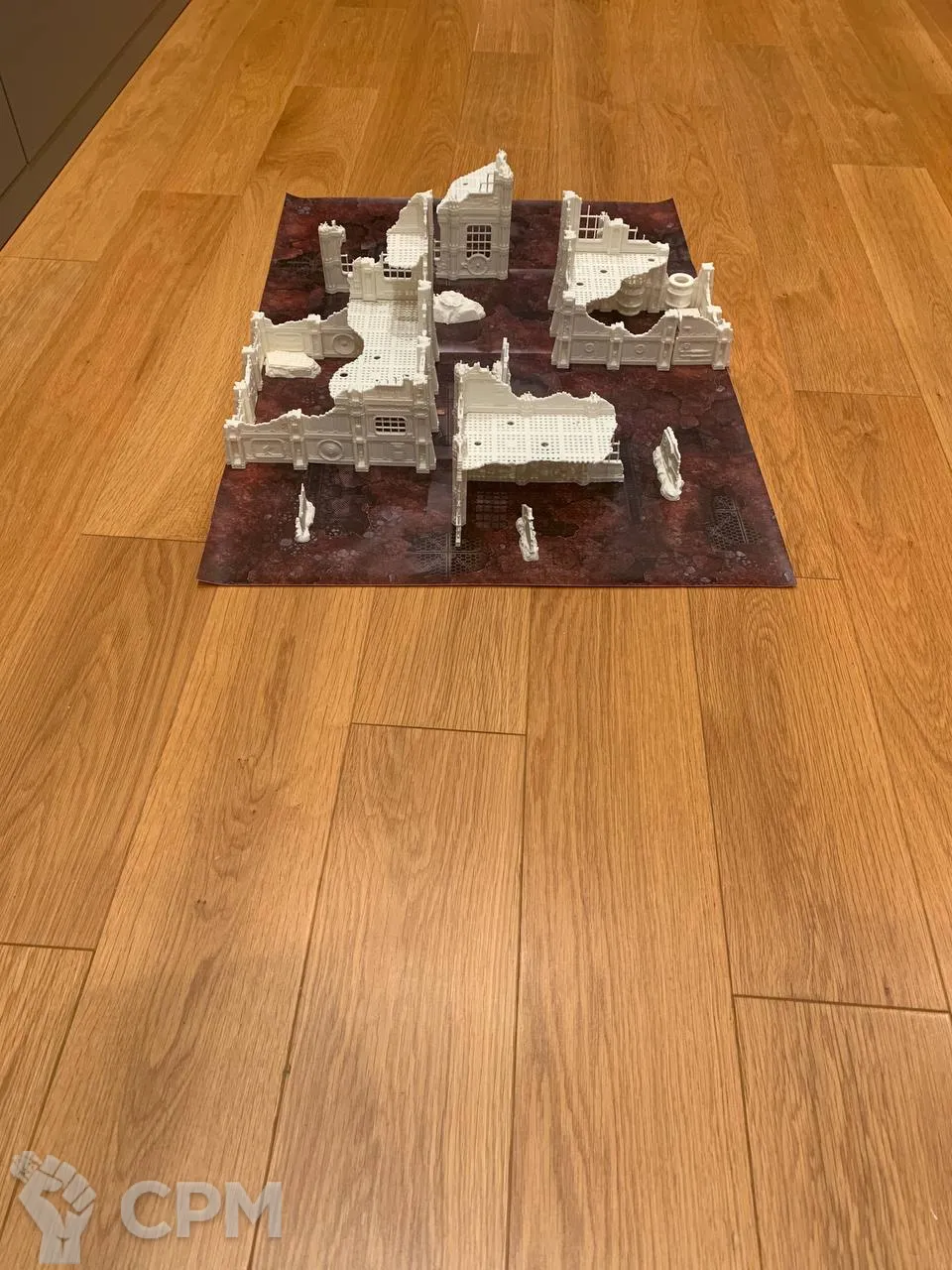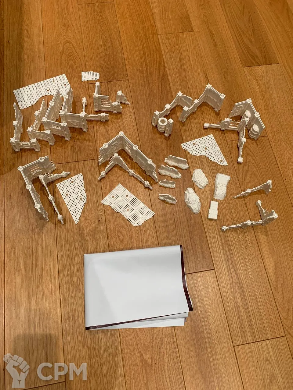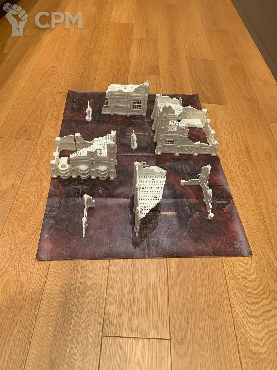 Комплект террейна Vlokus напечатанный на 3д принтере + батлмат 30х22 дюйма. Батлмат односторонний на литом банере. Террейн не в сборе, стенки собираются через "штырьки" (последнее фото), полы вставляются в паз. У полов и стен есть взаимные посадочные места под магниты. Террейн можно склеить, можно оставить в разбираемом виде для удобства транспортировки. На фотографиях террейн просто собран без ничего. Цвет белый - родной цвет пластика, под покрас. Имеются незначительные дефекты печати, которые легко правятся.
