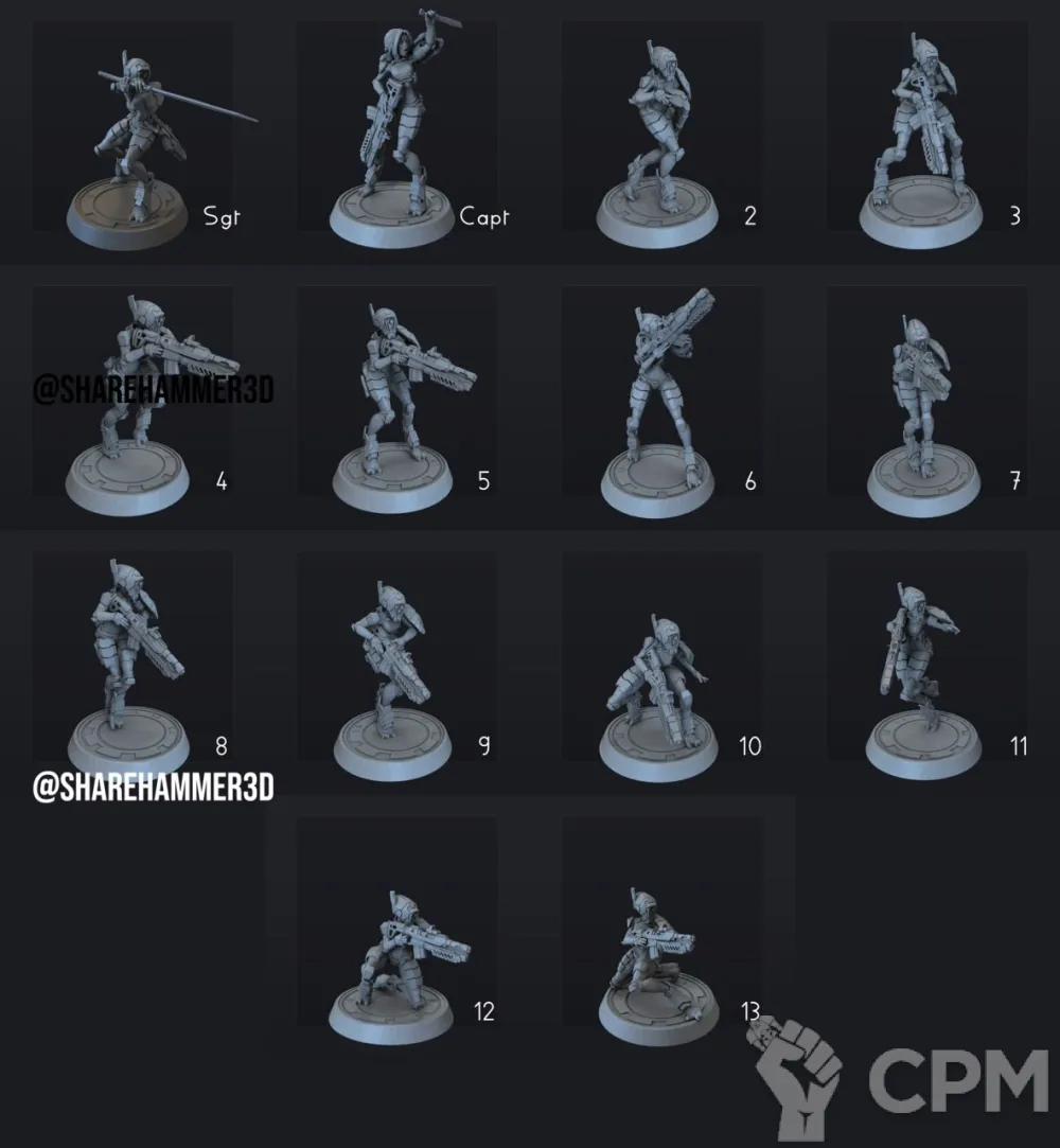 13 миниатюр. База в комплект не входит. Возможна печать дополнительных миниатюр или битсов.